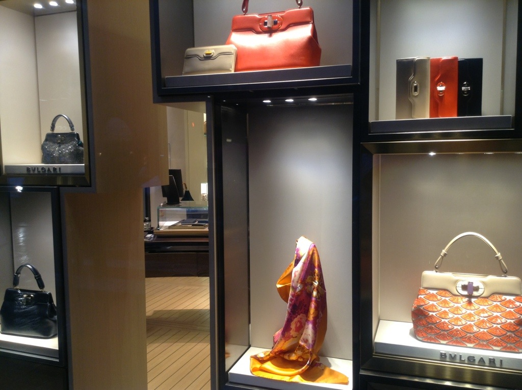 Guess the price of the red outfit, including shoes and no jewelry–9000E or $11,610. From what I saw, the shoes and belt were coordinated with the purse material wise to make a set, so I suppose sets of accessories are in now. In fact, several displays featured the same scenario. Oh, and by the way, while jewelry was on display it was not on display with the clothes. That means jewelry is not the main item any more and is being downplayed in favor of matching shoes, belt and purse. Since they are so expensive that makes marketing sense to me, jewelry a woman will keep, but when shoes change style, it’s time for new ones. That’s not a chauvinist statement, is it? Not meant to be.