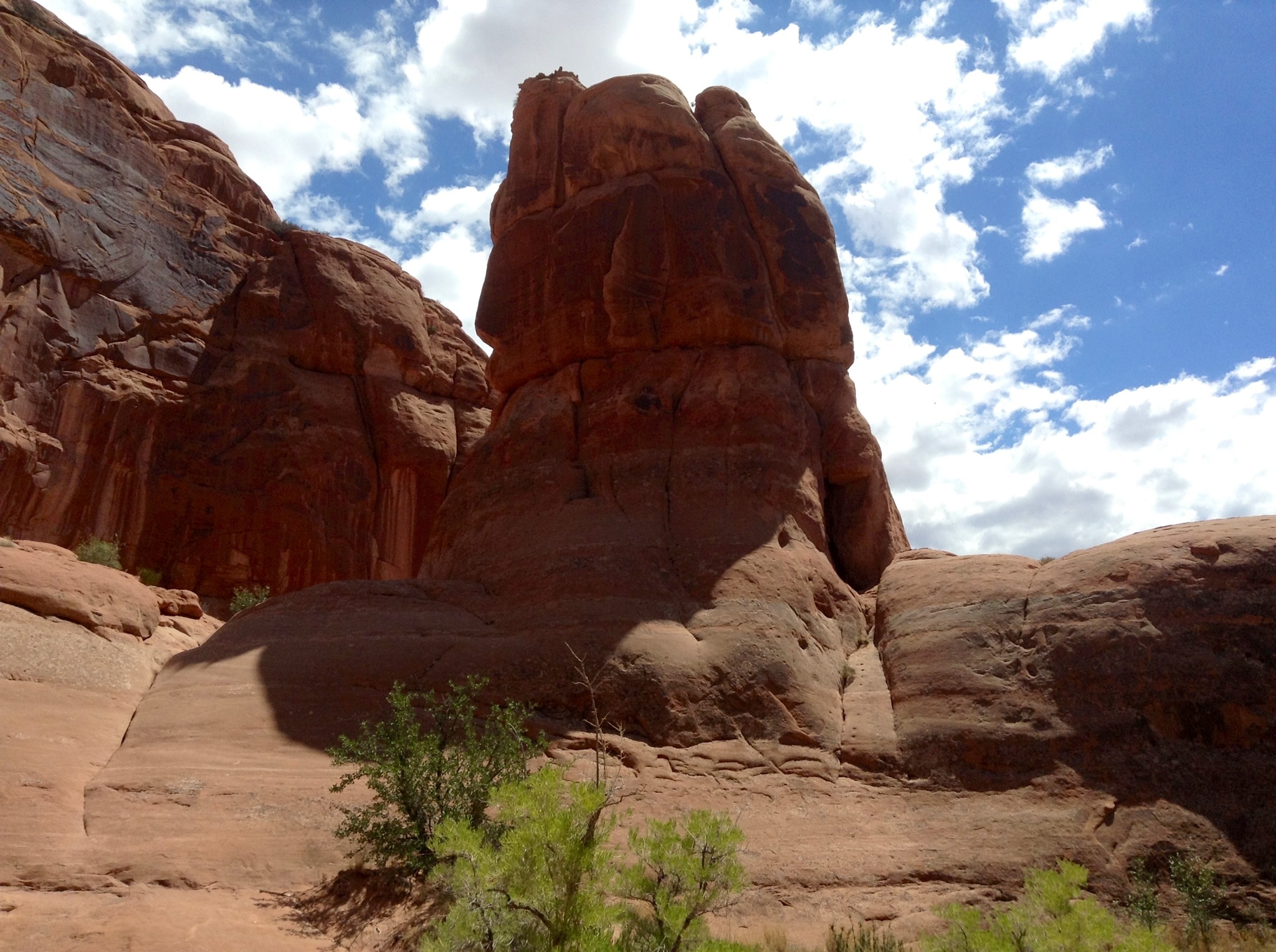 Somehow, in planning our western journey, I did not plan time for the wonders of Utah beyond the area around Park City. When we drove south toward New Mexico today, I discovered we would drive right by two national parks–Arches and Canyonlands. We would not have time to tour them. As we drove into the area, the landscapes were impressive. The rust red canyons and rock pinnacles thrusting into the sky called out for me to turn towards them and throw my schedule aside. Knowing that this was impossible, I resisted the siren call and drove steadfastly onward. We were blessed, however, in that the drive took us by amazing sights–a large mountain arch, red mountains made even brighter by a gentle rain falling on the rocks, deep canyons, fields of massed yellow flowers and unusual rock formations. If such beauty was on the borders of the highway, what beauty must lie within the parks? At least we were able to take a few photos as we drove past. Kathy and I consoled ourselves with the thought that we will return someday, God willing. WEG