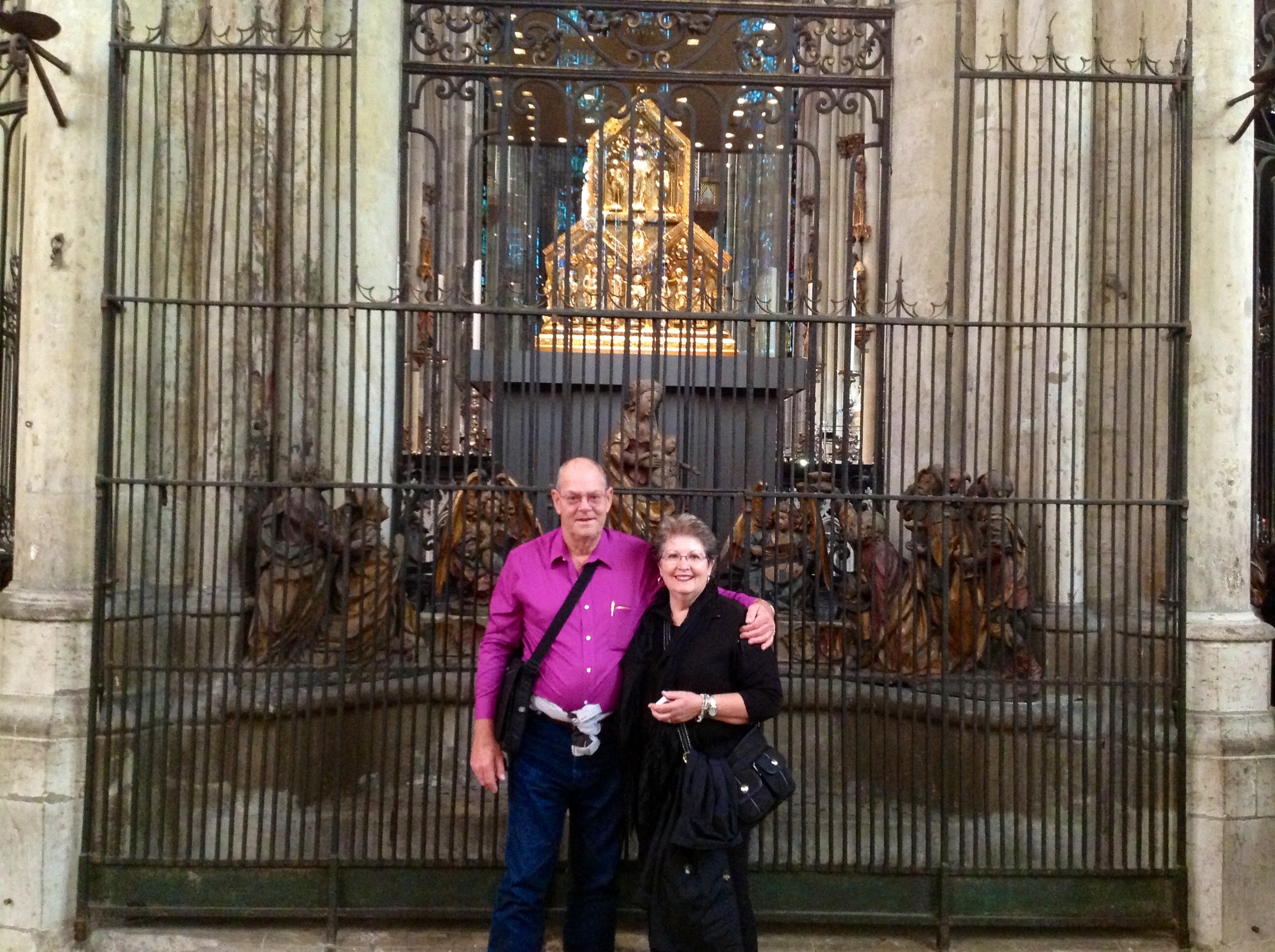 We spent a great afternoon in the magnificent Koln Cathedral. Its twin spires reach 516 feet and the Gothic structure is magnificent as it towers over the Rhine River. The flying buttresses almost seem delicate, like lace. The interior contains beautiful stained glass windows, but the highlight of the church is the huge gold container, in which, it is claimed, are the remains of the three Wise Men, who brought the gifts of gold, frankincense and myrrh to the Christ Child. The end cap of the container holds their three crowns, which are only displayed on January 6–Epiphany–the date on the Christian calendar commemorating the coming of the Wise Men to Bethlehem.