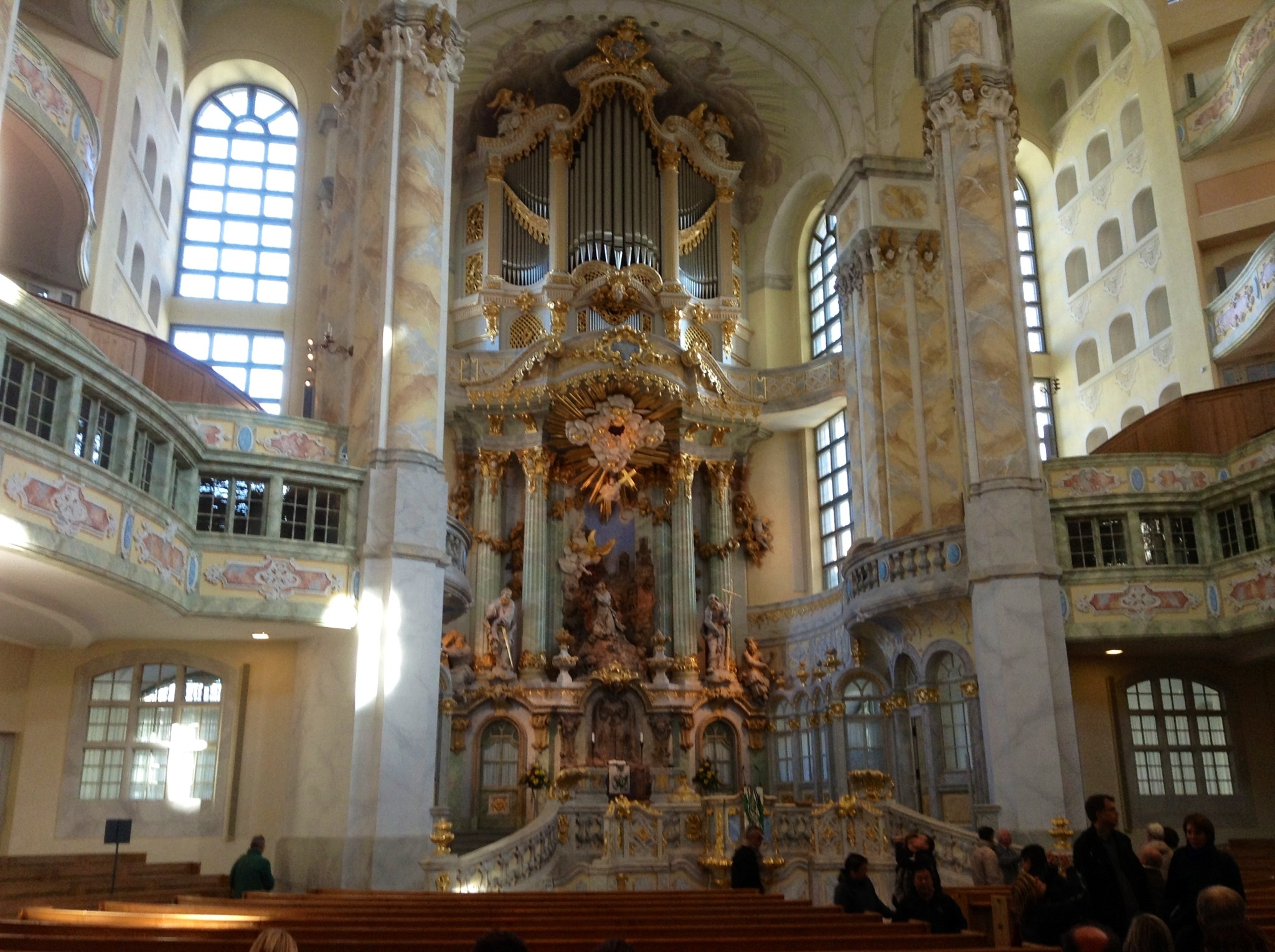 While both the Kreuzkirke and the Kathedral are large and impressive on the exterior with tall Baroque towers, it is the Frauenkirche that is the emblem of Dresden, and for good reason. It is a massive Baroque dome with an equally impressive Baroque interior of pink, white and gold. It has seven levels for seating with intricate balconies and a painted and layered dome. It was built by a staunch Lutheran populace to show their Catholic monarch that they could.