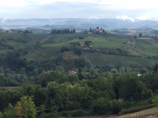We have chosen San Gimignano as our destination. An ancient hill town surrounded by a stone wall and beautiful church, it is noted for the 14 stone towers that dot the hill–emblems of wealthy medieval families who used them to showcase their wealth and remove them from the air below in the hope of keeping disease away, especially the plague. Narrow cobblestoned streets are lined with stone buildings, today housing businesses, especially colorful Italian pottery, and various eateries. Several piazzas beckon. It is a relaxing place, except in early afternoon when the tour buses arrive (they are gone by five). We are staying in a six-room agriturismo on an active farm/vineyard just outside the city walls, held by the family since the 1500s. An organic establishment, we have vegetarian breakfasts and the chatty owner regales us in story after story. An anthropologist who has come back home from work amongst unheard of tribes and research for National Geographic, she needed to rescue the family heritage after her grandfather’s stroke. She speaks five languages! We are thankful for this amazing experience. WEG – September 4 & 5, 2015