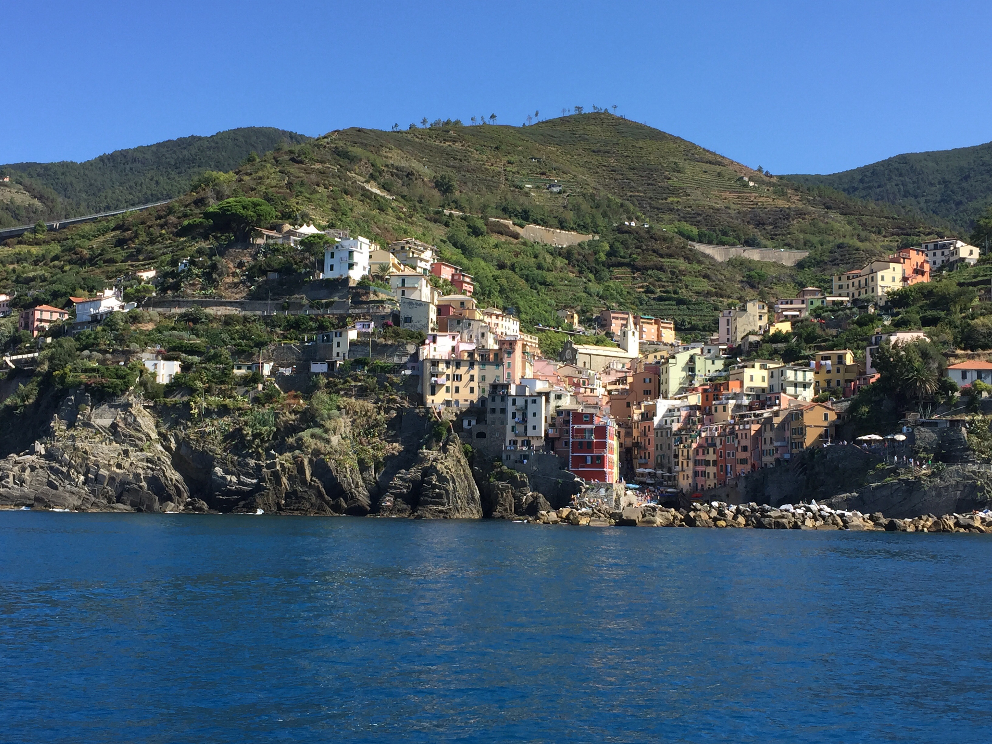 Taking the ferry out of Lerici along the Mediterranean coast to the Cinque Terra (five lands/cities that time forgot) we were immediately impressed with how clear and clean and blue the waters of the sea were. The five cities with their pastel buildings scrunched together along the crags of the cliffs above the water stood out like jewels above the deep blue. The water was calm and the ferry could dock at port–not always a possibility. We were blessed.
