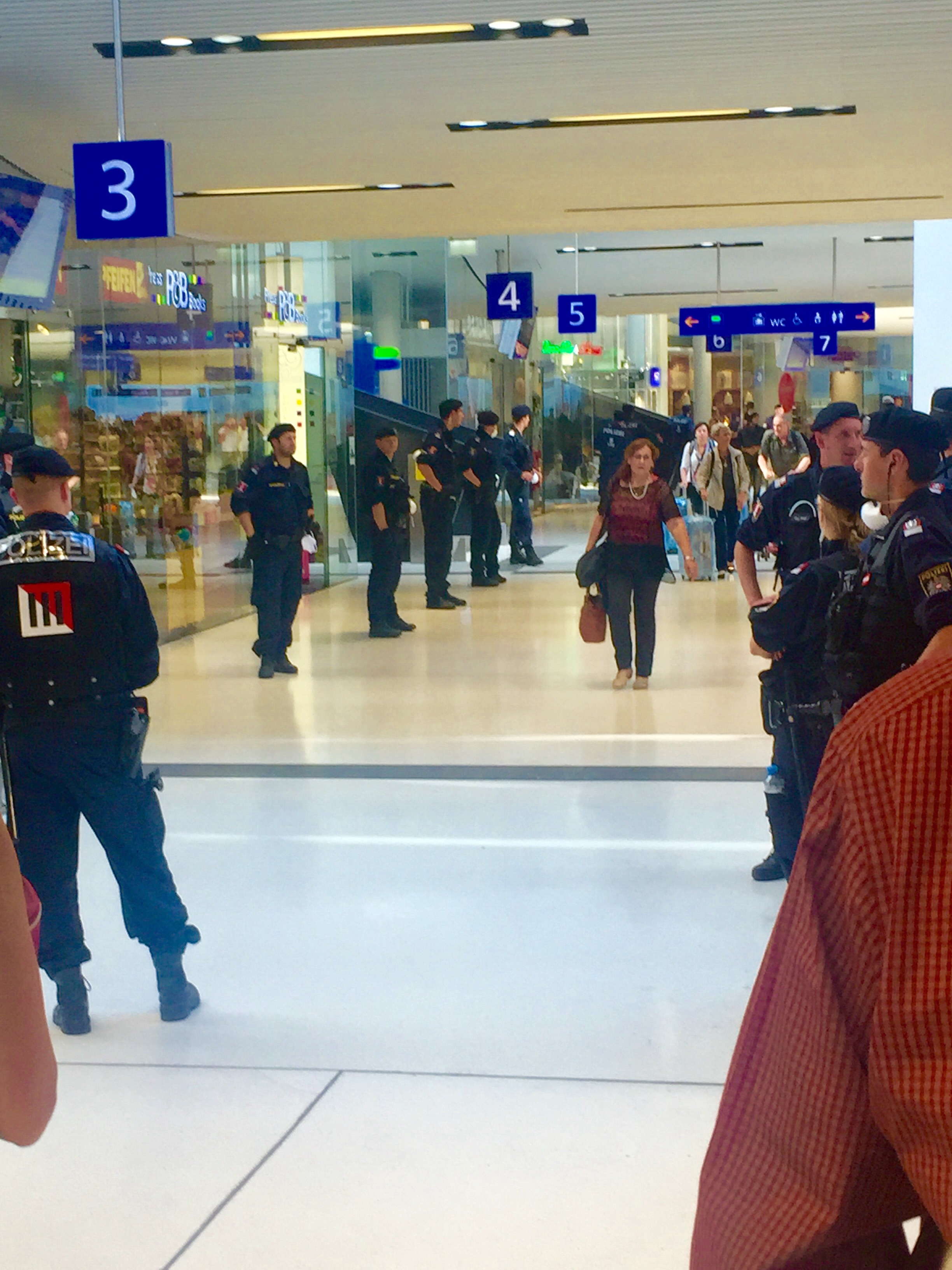 Salzburg’s train station was guarded heavily by uniformed police as 4,000 Syrian refugees sought to gain entry into Germany the day of our arrival.