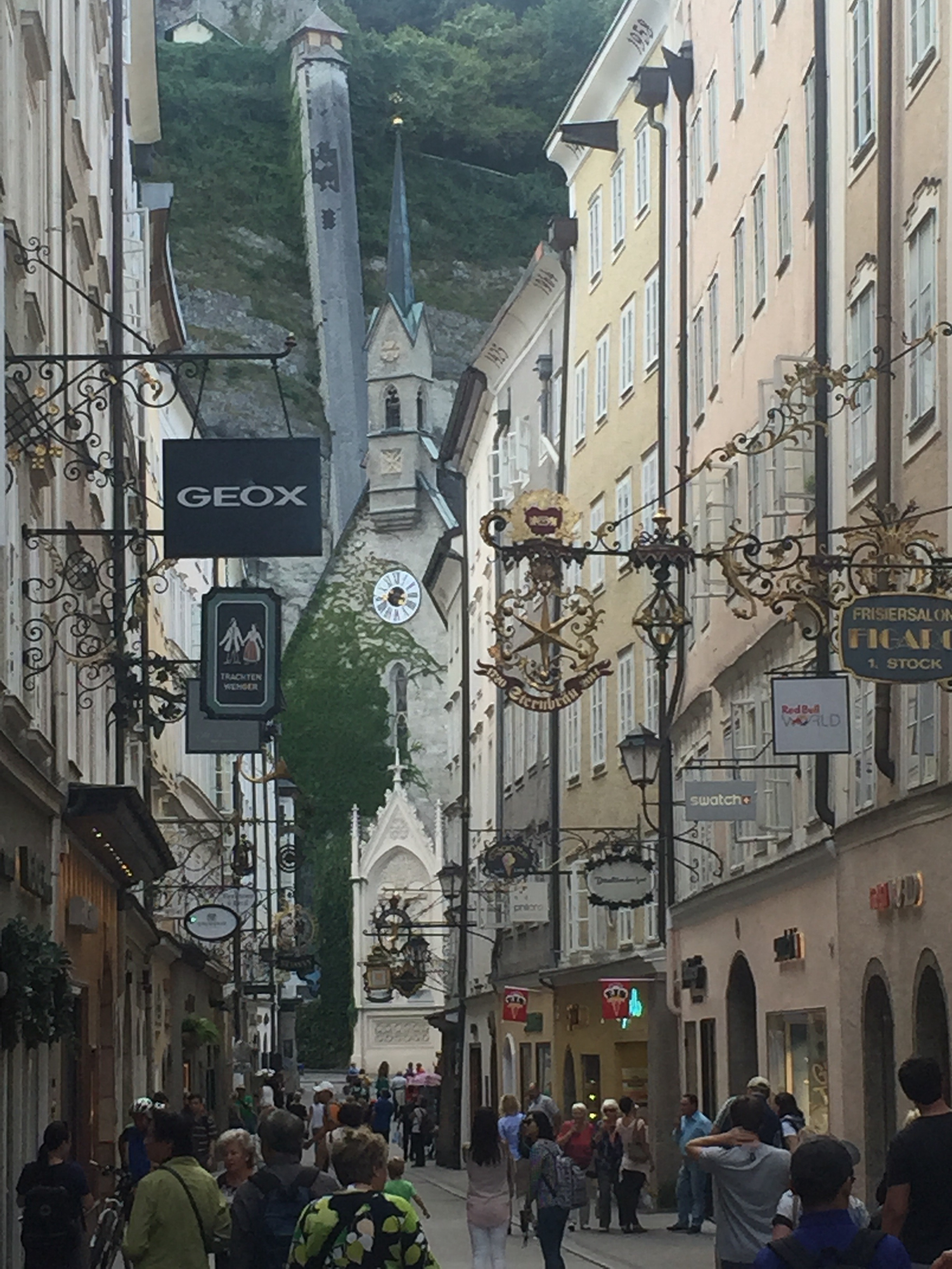 With that sober experience in our minds, we taxied to our hotel and took a walking tour of beautiful Salzburg with the Hohensalzburg Fortress towering on the bluff above the city. We saw Wolfgang Mozart’s home on one of the busy streets. Salzburg is an upscale city, clean and charming with many fashionable shops.