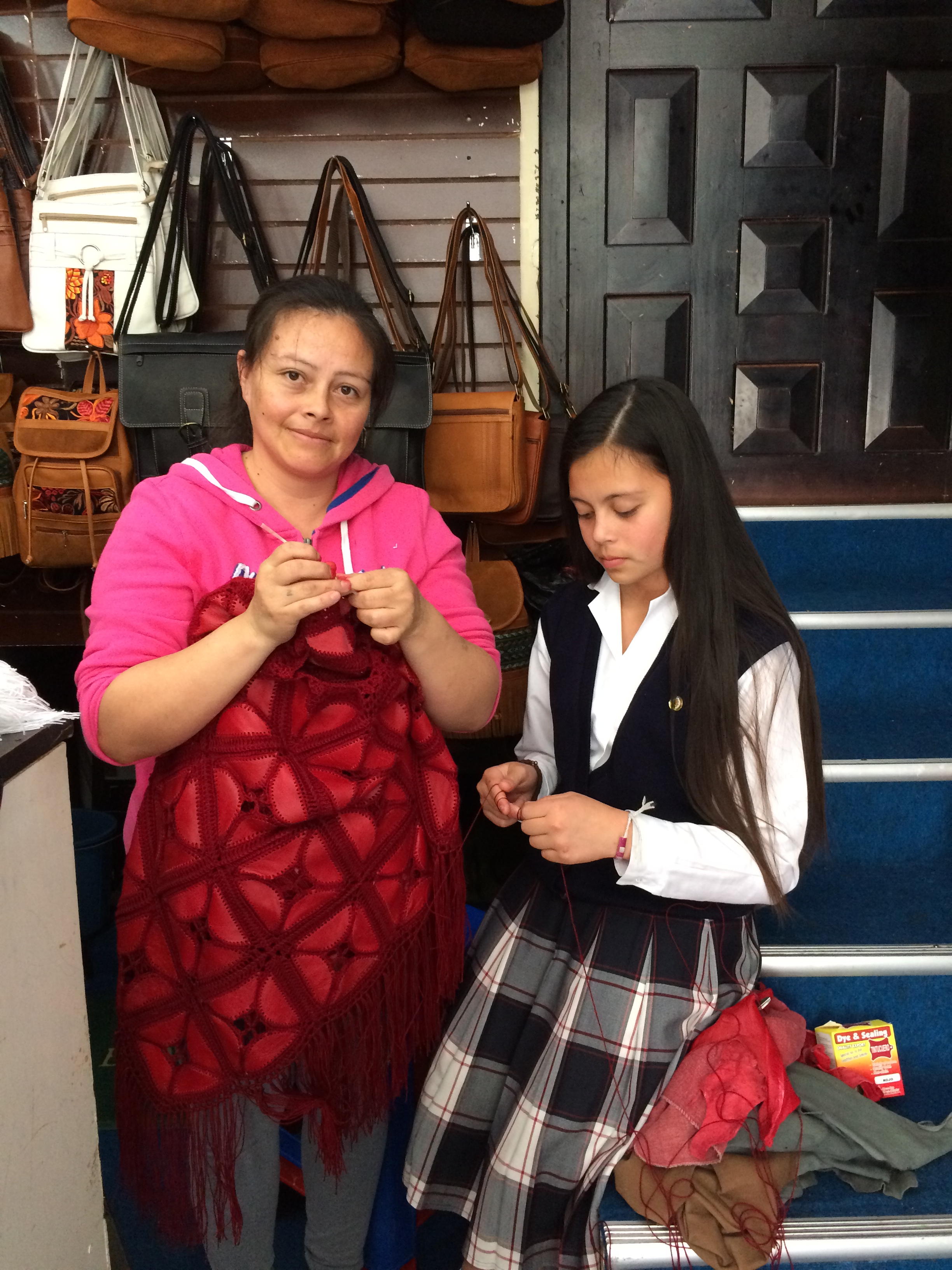 A Cotacachi seamstress puts finishing touches on crocheted leather cape