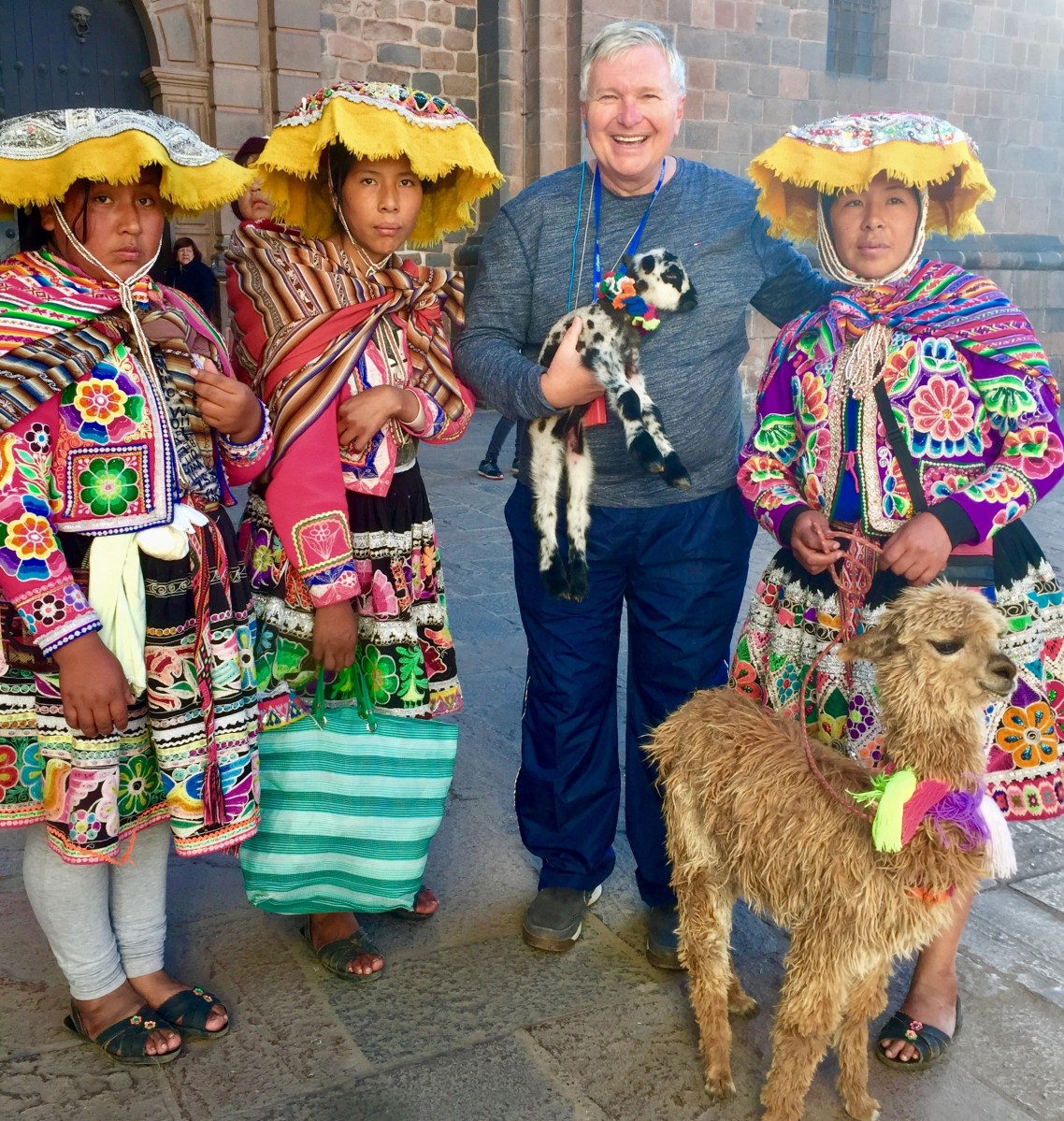 Wayne parties with the locals in Cuzco as he carries a lamb.