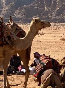 We arose early for our long journey back to Israel. Our exciting experience along the way was time on a Jeep ride—pickups with built-in seats in the bed—into the Wadi Rum, the south Jordan desert. The movie, The Martian, and portions of both Star Wars and Transformers were filmed in the desolate, sandy, rock mount area. The sand is reddish brown and fine. The rock formations that jut up through it are intriguing—towers, shards and rounded boulders mixed together. We stopped along the way to climb a sand dune. We took off our shoes and sank deep. With absolutely no moisture, the sand does not cling. The day was wonderfully cool and the bright sunshine made it bearable.
