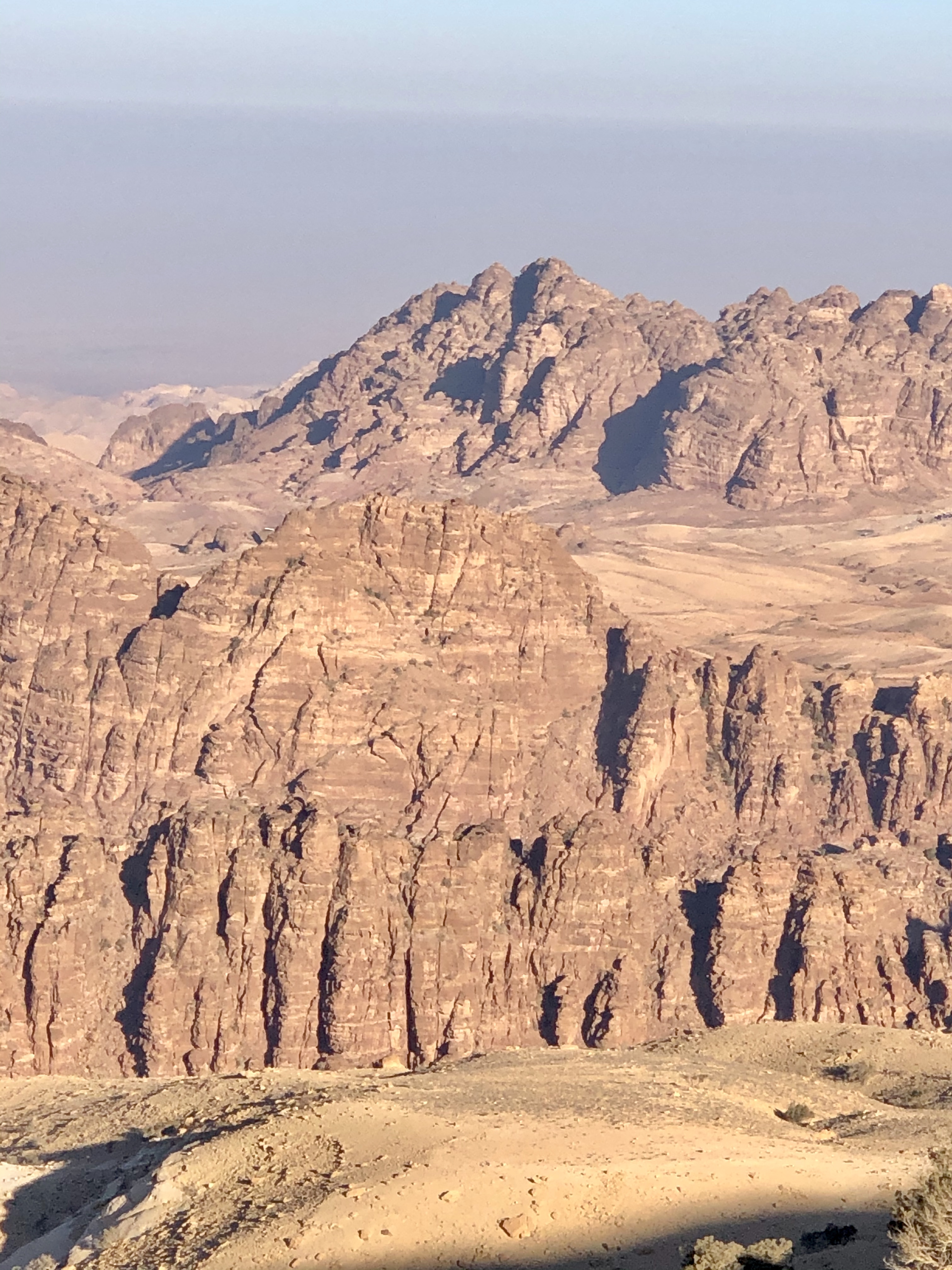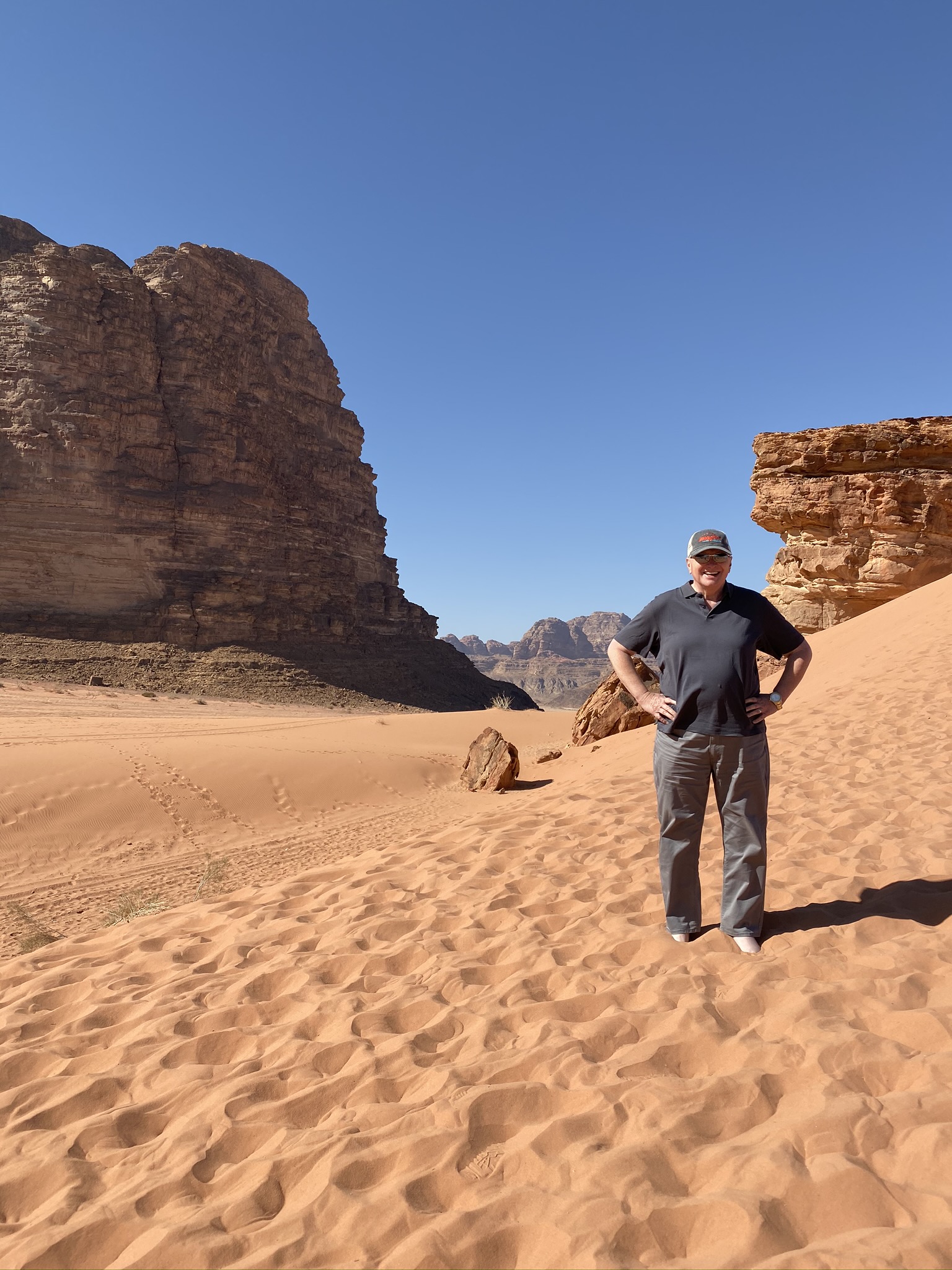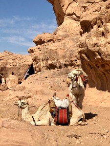 We arose early for our long journey back to Israel. Our exciting experience along the way was time on a Jeep ride—pickups with built-in seats in the bed—into the Wadi Rum, the south Jordan desert. The movie, The Martian, and portions of both Star Wars and Transformers were filmed in the desolate, sandy, rock mount area. The sand is reddish brown and fine. The rock formations that jut up through it are intriguing—towers, shards and rounded boulders mixed together. We stopped along the way to climb a sand dune. We took off our shoes and sank deep. With absolutely no moisture, the sand does not cling. The day was wonderfully cool and the bright sunshine made it bearable.