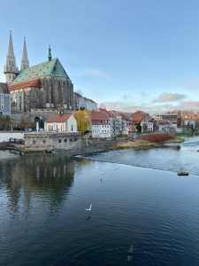 We returned to Germany via a pedestrian bridge in a scenic part of the river. Directly in front of us was a majestic Lutheran Church, closed for some repair and rehearsal prior to a weekend concert. We heard a pipe organ playing through the massive walls. We were in the Altstadt (historic section) of Gorlitz. It was beautiful, and workers were everywhere preparing for the Christmas Markets that are to open this weekend. An ice skating rink was already open in a city square and filled with laughing children. We entered another large Lutheran Church from the 1200s. Painted ceilings and walls highlighted the long nave with a beautiful carved altar drawing attention. Fascinating.