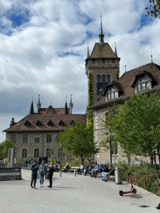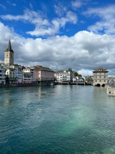 We were hungry but not too—you know that feeling. We found just the right place in a beautiful platz (plaza) just by an impressive church with bells chiming. We sat outdoors under umbrellas on this bright but cool day. The hot soups and hot chocolate hit the spot. From there, we lollygagged our way around the old town, which is simply stunning and at the same time refreshing. The beautiful narrow pointed Swiss style towers stood out across the skyline. The crystal clear Limmat River runs through the heart of the city into Lake Zurich with high green hills jutting up and the Alps in the far distance. The Krahn’s and Paluch’s caught a tram back to the hotel and the Standly’s and we walked back along the Limmat. It was all cobblestone as we took little detours up narrow alleys and streets and then back to the main walkway. Trees, just starting fall coloration, lined the river in places, and we were totally refreshed by the walk. Then we all took naps—much needed because by mid-afternoon it had already been a long day.