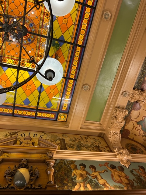 Steele’s, who had been in Scotland, joined us in Zurich. This is a special restaurant dating back to 1444. Kathy and I had eaten here 25 years ago on our first visit to Zurich and loved it. Even though we had returned to Zurich over the years, we had not eaten there again. This time I decided we should return because it is a very traditional Zurich restaurant and some of our friends were first time visitors to Switzerland. The ceiling is painted with cherubs and a stained glass window dominates the center ceiling. Heavy wood paneling abounds. It was delightful and the new fall game specialities were offered in addition to the regular menu. Kathy fell for the wild boar as did Rhonda, complemented with roasted chestnuts, Brussels sprouts and pear with raspberry. Randy loved his stag steak. The rest of us opted for traditional pork knuckle or cordon bleu or sausages. For dessert, Marty opted for the fresh apple fritters with vanilla cream sauce and we declared it the dessert winner. It was a wonderful dinner in wonderful ambiance and wonderful company. We will all sleep well in the cold (46F) night Zurich air under down duvets with huge down pillows. By the way, European hotel beds no longer come with top sheets—bottom sheet and bed covering—that’s it. Schlaft guht!