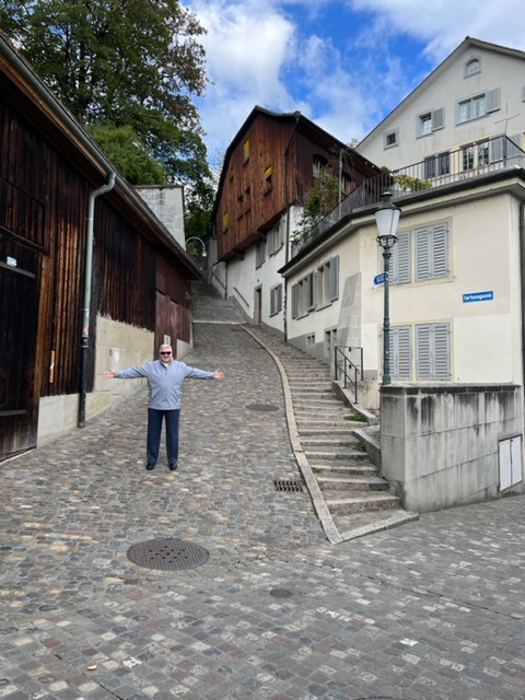 We were hungry but not too—you know that feeling. We found just the right place in a beautiful platz (plaza) just by an impressive church with bells chiming. We sat outdoors under umbrellas on this bright but cool day. The hot soups and hot chocolate hit the spot. From there, we lollygagged our way around the old town, which is simply stunning and at the same time refreshing. The beautiful narrow pointed Swiss style towers stood out across the skyline. The crystal clear Limmat River runs through the heart of the city into Lake Zurich with high green hills jutting up and the Alps in the far distance. The Krahn’s and Paluch’s caught a tram back to the hotel and the Standly’s and we walked back along the Limmat. It was all cobblestone as we took little detours up narrow alleys and streets and then back to the main walkway. Trees, just starting fall coloration, lined the river in places, and we were totally refreshed by the walk. Then we all took naps—much needed because by mid-afternoon it had already been a long day.