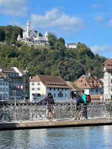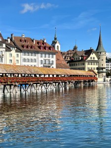 It was one of those majestic days where you store the beautiful memories in your brain to recall when you are sitting in the dentist’s chair. Lucerne is that kind of place. Charming, quaint, Swiss to the max with towers everywhere, snow-covered mountains in the distance, glittering lake crowned with a stunning white chateau on the hills above, clear rushing river through the city and painted buildings around every corner. I did not put the phone camera away. The Krahn’s, Paluch’s and we boarded a train and in less than an hour riding through pastoral scenes we arrived in Lucerne.