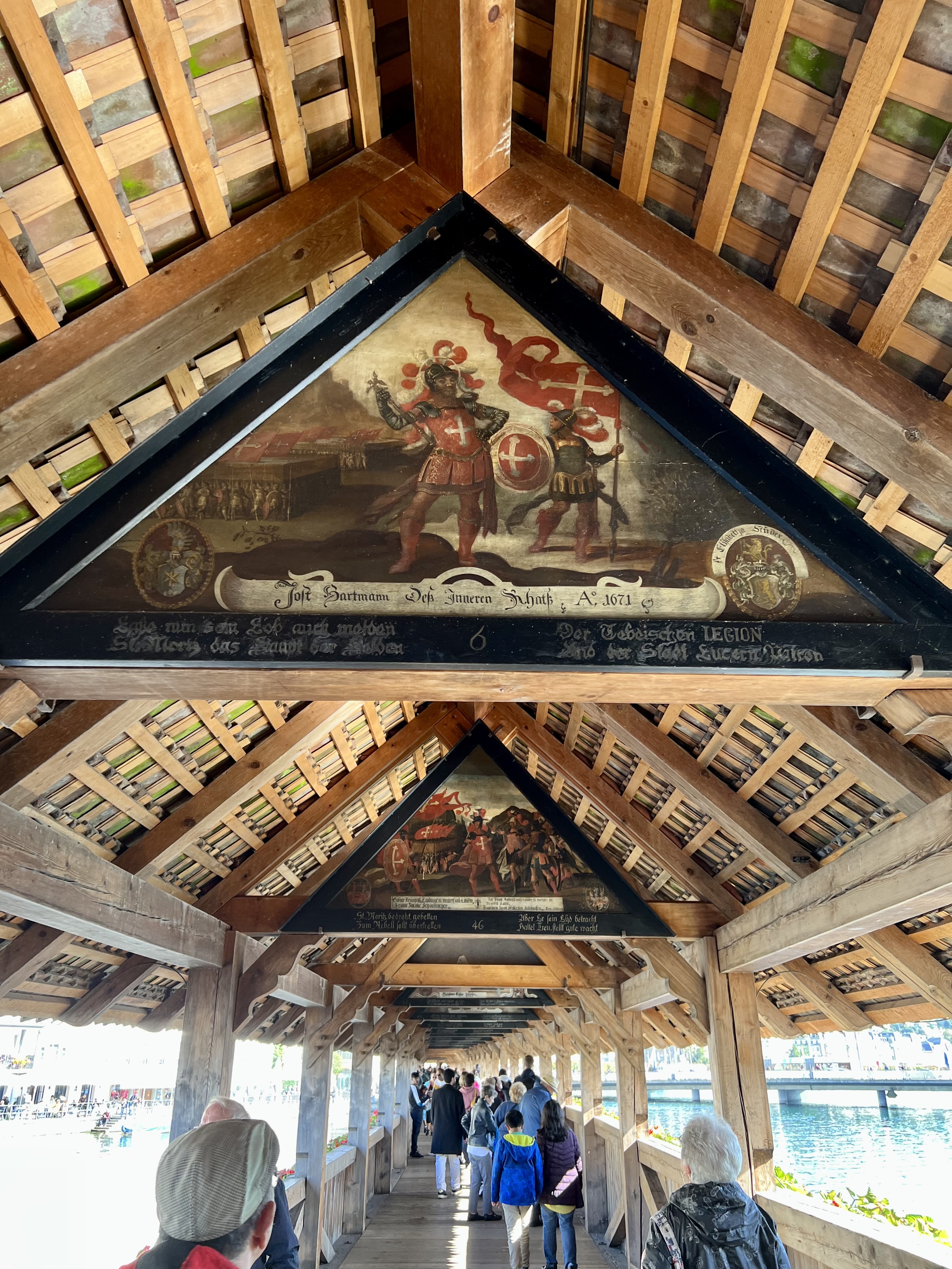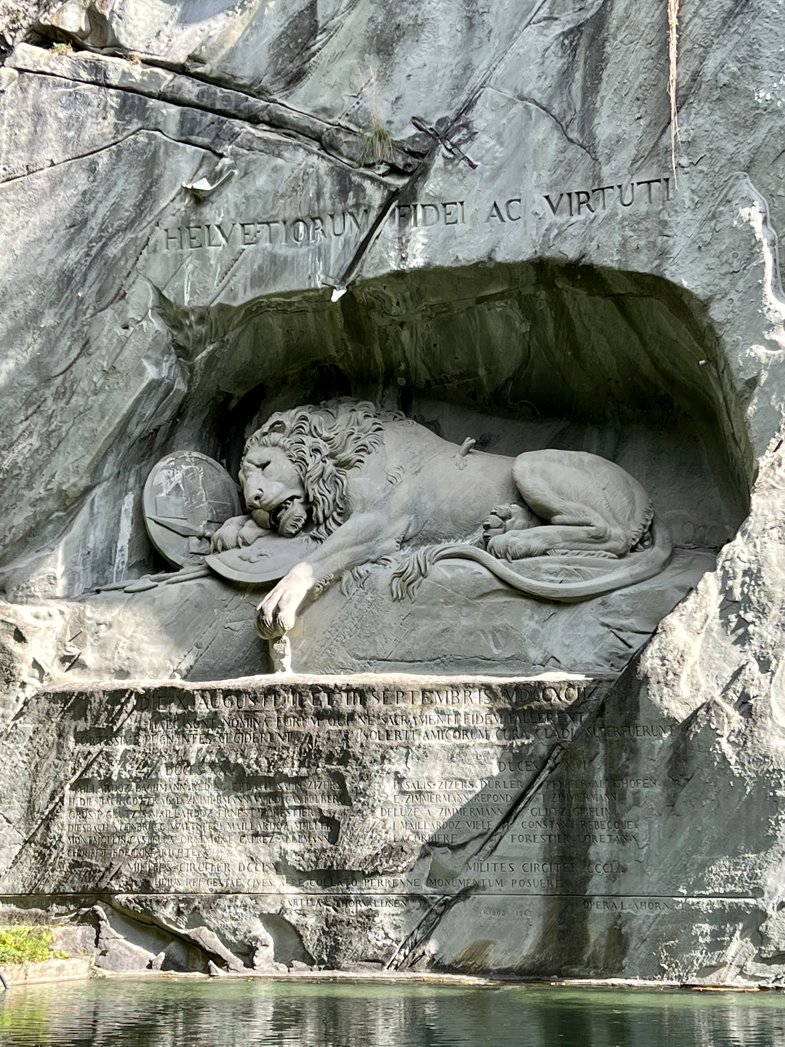 We walked the iconic covered Kapellbrucke (Chapel Bridge) over the Reuss River for which the city is known. Lined with overflowing flower boxes, the wide bridge has wooden tresses from which old paintings are suspended all along the way. Built in 1333, the walk implored the mind to go back into the Middle Ages. Mine did! Once across, we walked the short distance to the “Weeping Lion” sculpture carved into the mountainside to honor the Swiss guards killed in the French Revolution. The lion’s expression as it lay dying from a spear thrust into its side is mournful. The author Mark Twain, upon visiting Lucerne, said it was the most sorrowful sculpture in the world. We sat for several minutes simply gazing upon the impressive mountain carving.
