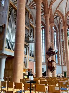 All of us got into the wonderful Lutheran/Evangelical Heiliggeistkirche (Holy Ghost) church and, fortunately, an organ student was practicing on its mighty pipe organ. Karen Paluch and Kathy visited with him and eventually, he played for us a marvelous Buxtehude piece with soaring sounds and intricate foot work on the bass pedal keyboard. It was a grand experience in a beautiful church.