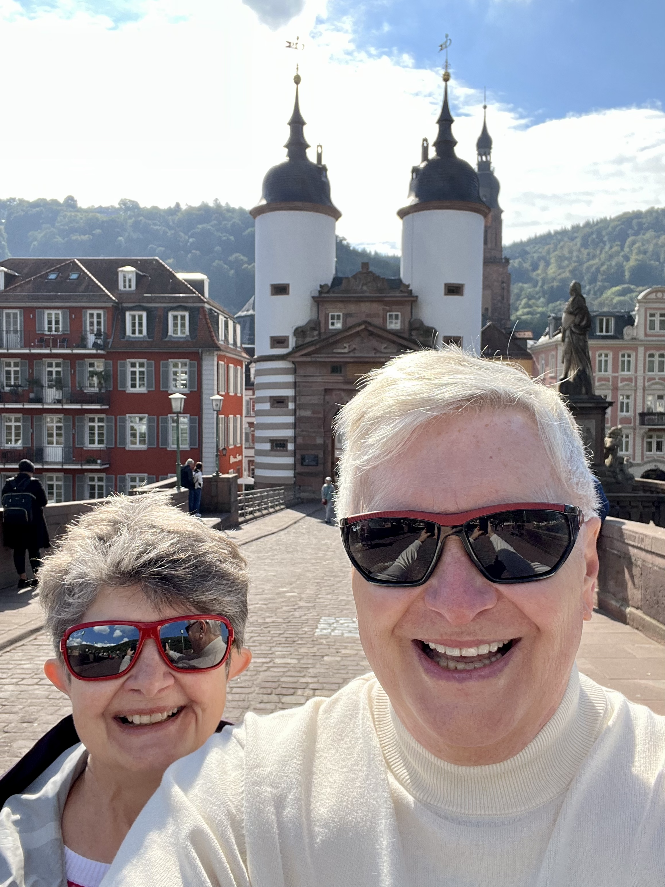 The storybook Neckar Valley city of Heidelberg, Germany, is charming to the core. There it sits in haze and sometimes fog (later today was clear and sunny) with its old medieval city gate and bridge standing proudly along the river and the majestic schloss (castle) ruins positioned on its perch on the hills above. The pedestrian walkways through this ancient university city are bustling with fine shops and eateries inside picturesque buildings with an old German architecture. Towers of churches and conical shaped turrets are around every corner. It is a joy to the eyes and, thankfully, the cobblestones in the city are easy on the feet—not so in the castle ruins above. The Standly’s and Paluch’s enjoyed taking the funicular up to the ruins and seeing the sweeping sights of the river valley and city below. They also saw the world’s largest wine barrel which holds 58,124 gallons.