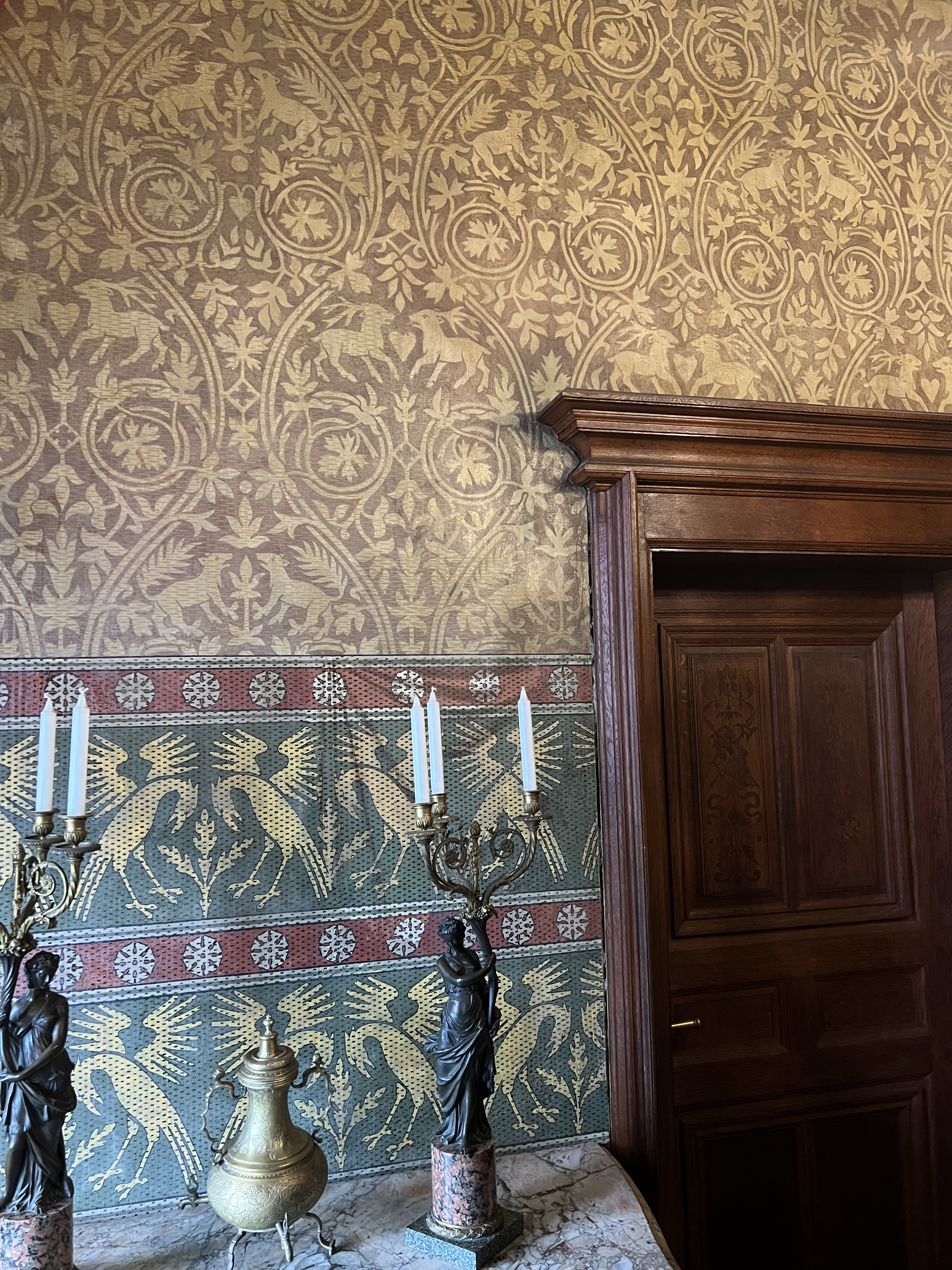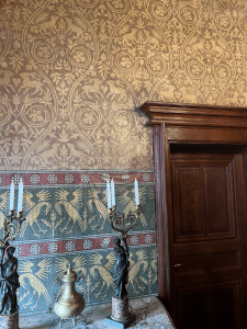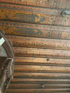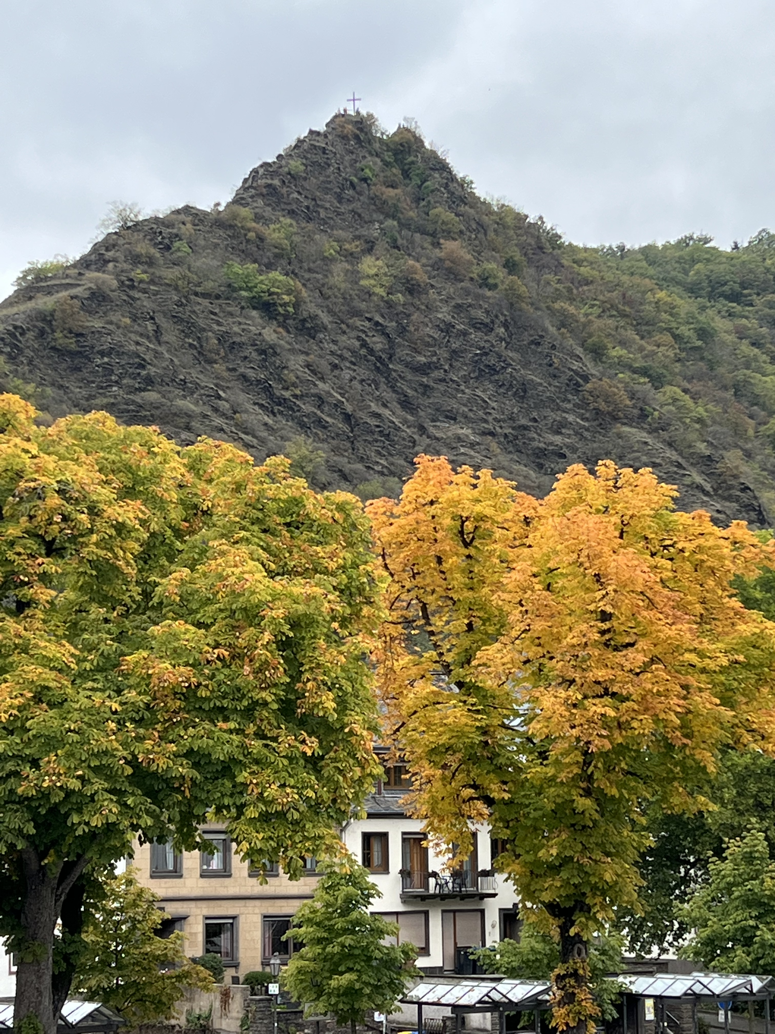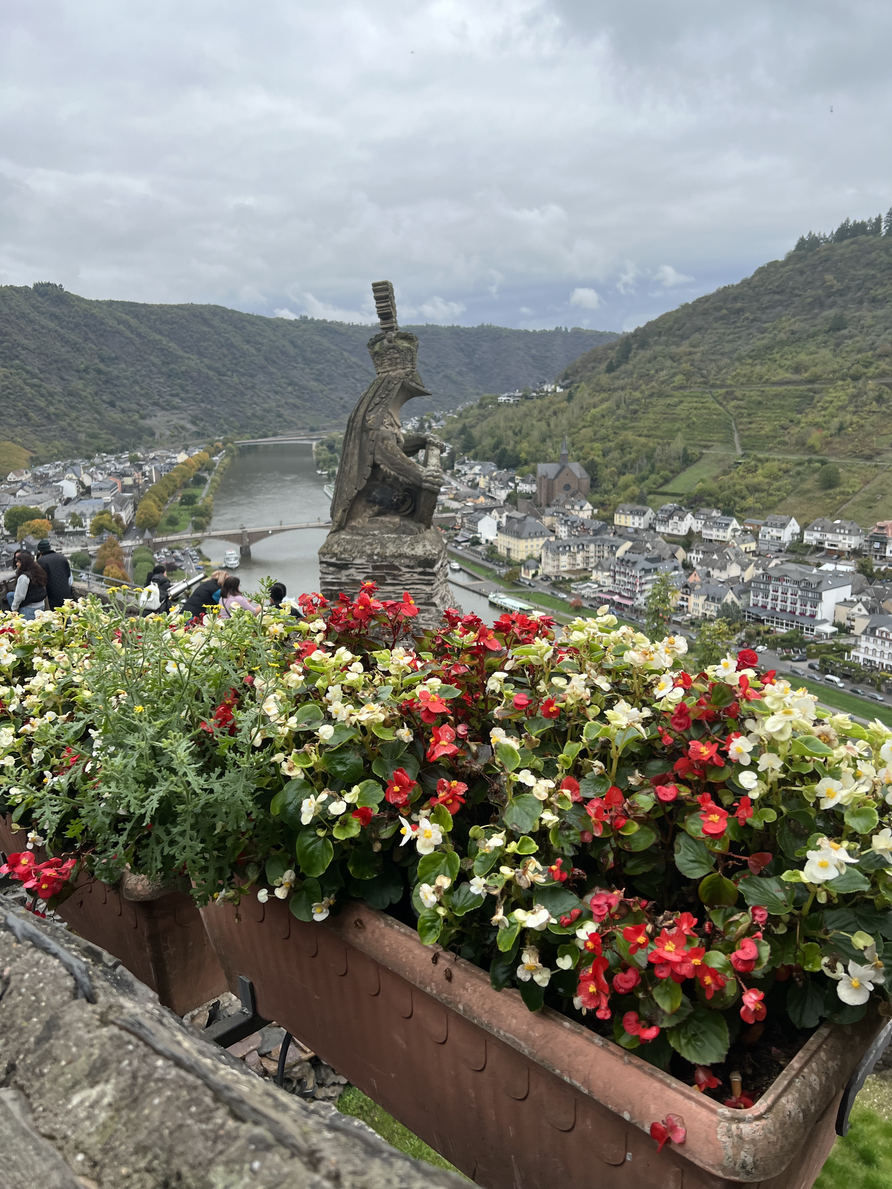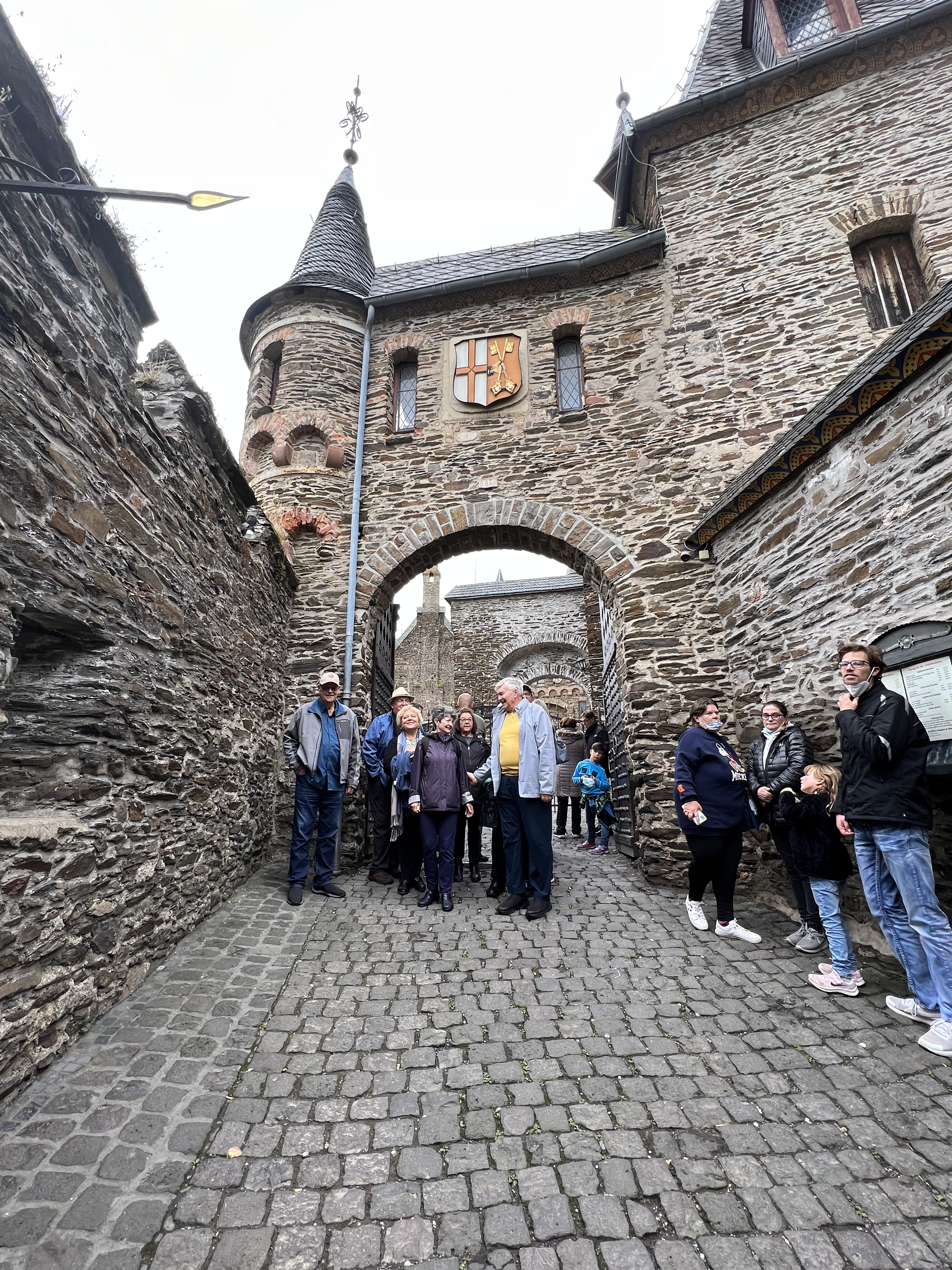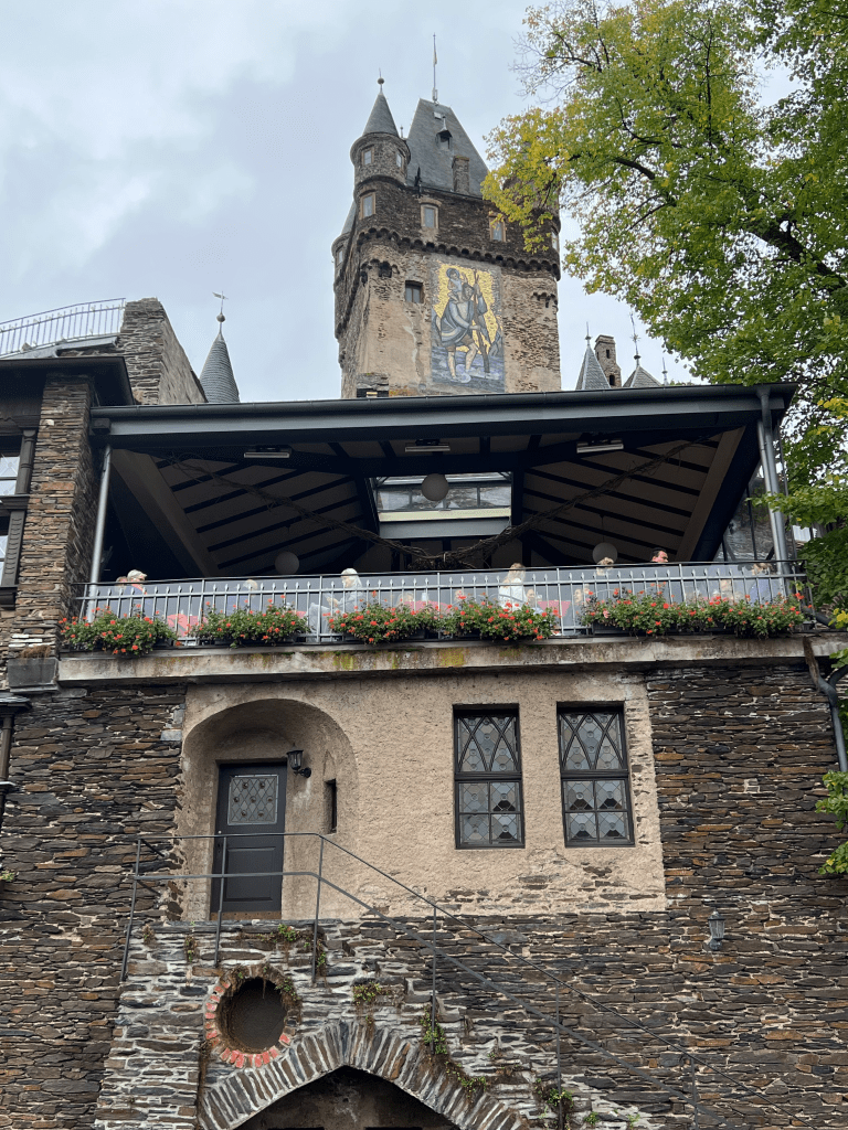 Oh, how we quickly fell in love with Cochem, Germany, on the banks of the Mosel. An amazing fairy tale castle looms over the medieval city. Narrow cobble stoned streets wind through the old town. Our bus trip up very narrow passageways to the castle above was fun. Our time in the castle was awesome! Begun in the year 1000 A.D., the castle was used for defensive purposes and has had several wealthy owners over time. Today, the city owns the castle. Antique furniture from the 13th century onward filled the rooms. The painted ceilings throughout were wondrous. However, what we thought was wallpaper in many of the rooms was intricate hand painted surfaces and not wall paper at all. The wood carvings on walls and hand rails were from the 14th century and were beautiful. Outside turrets and towers reached upward and vines crawled up many surfaces, now turning bright red. We all had a very satisfying adventure at the castle. We ended our day at a great restaurant along the river. Several of us ate the venison with cranberries (mixed with lingonberry) and spaetzel (the best spaetzel I have ever eaten)—our last German meal since we leave for Spain tomorrow.
