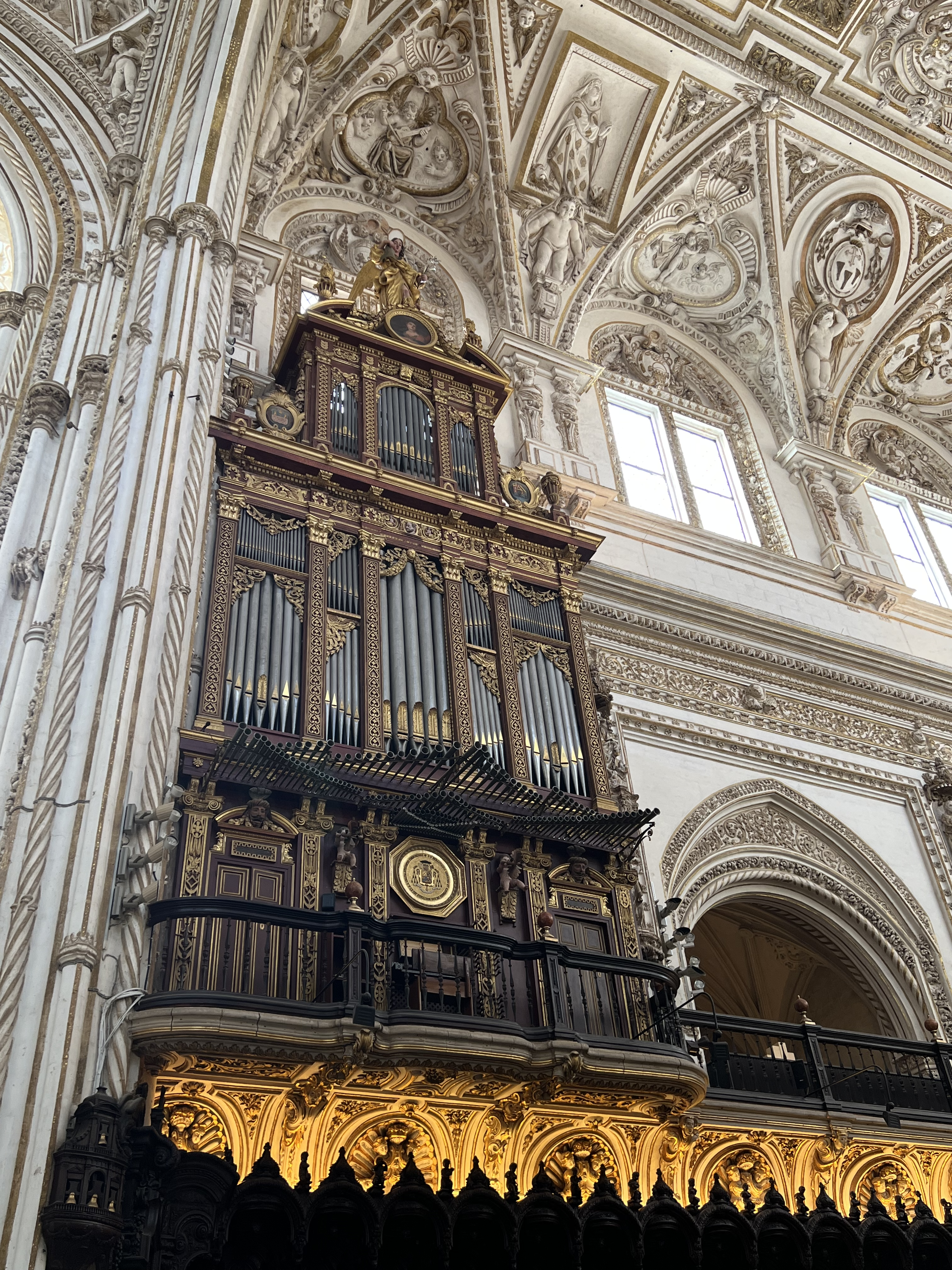 Cordoba is know for two main structures—the Roman era bridge and the Mesquita or Mosque/Cathedral. Both are wonderful experiences; however, the Mesquita was awe inspiring! First a church, it was taken down by the African Muslim Moors after they invaded Iberia and parts were reused to build a mosque on the site. Later, after the Reconquista (the European invasions that pushed the Moors back into Africa after their 700 year occupation of Iberia), the mosque was rechristened a Christian Church (Roman Catholic Cathedral) and parts of it remodeled to reflect Christian symbolism. The result is a phenomenal sight. Row upon row of burnt red and white striped arches supported with columns in perfect symmetry reach, seemingly endlessly, in every direction. The ceiling is relatively low, casting a dark shadow into the distance. It is a mysterious sight. Then, all of the sudden, you walk into a central area with white high sculpted ceilings with windows that flood the area with light. Beautiful wood carved choir stalls with a pipe organ stand in the distance and a beautiful altar beckons worship. A guide explained that light and enlightenment piercing darkness are central teachings of Christianity, and Islam teaches shadows and mystery and this explains the difference in the architectural styles exhibited in the cathedral. We were enthralled and spent several hours exploring the Mesquita that can now hold 40,000 people within its walls.