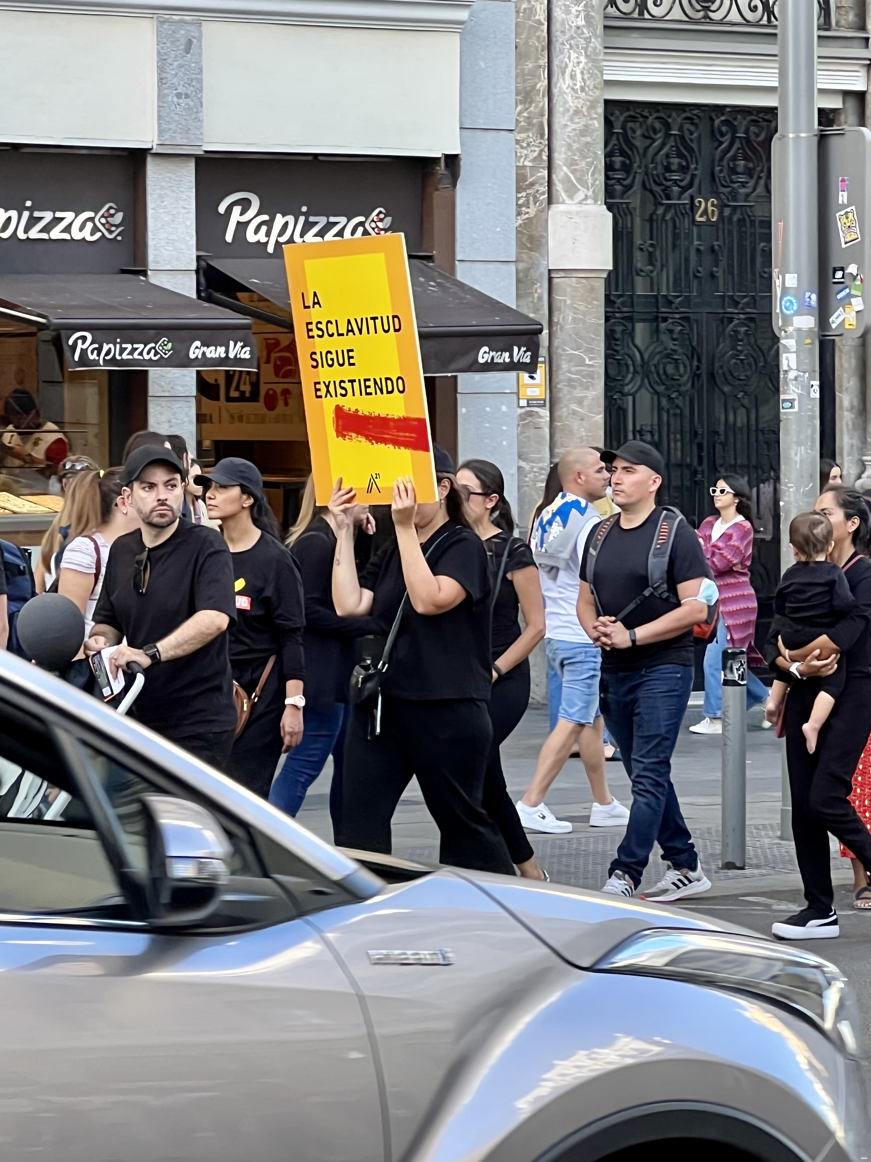 Being close to the Grand Via, Madrid’s shopping mecca with amazing architecture all around, we decided to see what that was about. We had to stop often to view the sculptures on the impressive buildings. The stores were jammed with shoppers—we were so surprised with this. Restaurants were packed. The Krahn’s and Standly’s went to eat at Spain’s oldest restaurant, “Sobrino de Botin“, famous for roast suckling piglet. They said it was very good! For lack of a better phrase, I would say our experience on the Grand Via was glamorous. As we strolled, there were demonstrations on the main boulevard. The one for pension justice for seniors was long and had many thousands of senior marchers. The one to bring awareness to the problem of human trafficking contained about a thousand Christian teens all dressed in black. Everything was peaceful and the marchers were drawing media attention.