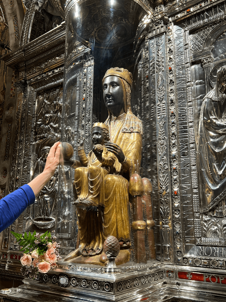 Kathy and I went to Montserrat, the mountains and monastery by that name outside of Barcelona. What a surprise as we were enthralled by what we saw. The mountains gave Gaudi his inspiration for his building designs. The mountains have pillars of stone that give the same melted wax appearance as his columns and the plants and vegetation of the mountains find their way into his nature designs. The views from the heights overlooking the hills and valleys beyond were amazing. However, it was the monastery that drew our undivided attention. We were pleased to experience the monastery boys’ choir, the most celebrated choir in Spain. The chapel is a jewel box of beauty as it is one of the most important sites in the nation. The chapel houses the famous “Black Madonna”—Mary and Baby Jesus. The vision of the madonna in the mountains drew visitors for centuries with Queen Isabella of Spain and St. Francis of Assisi being among them. Eventually the image of the Madonna was copied and carved from marble and the marble was black in color. Now pilgrims worldwide come to see the statue. We joined the throng. As we walked upward in long corridors leading to the statue not a sound could be heard. People moved forward in hushed silence. Even the walking was soft and quiet. Each room on the way was more exquisite than the one before. Craftmanship in wood, mosaics, marble, ceramics and paint was superb. The room housing the Madonna was gold and silver. Protectively housed in a glass enclosure, the Madonna holds an orb in her hand with Baby Jesus in her lap. A small portion of the orb is exposed so one can touch it. Behind the statue is a large beautiful chapel so that the Madonna can be viewed from behind. Outside the room are 1000’s of lit candles. We were thankful for the experience.