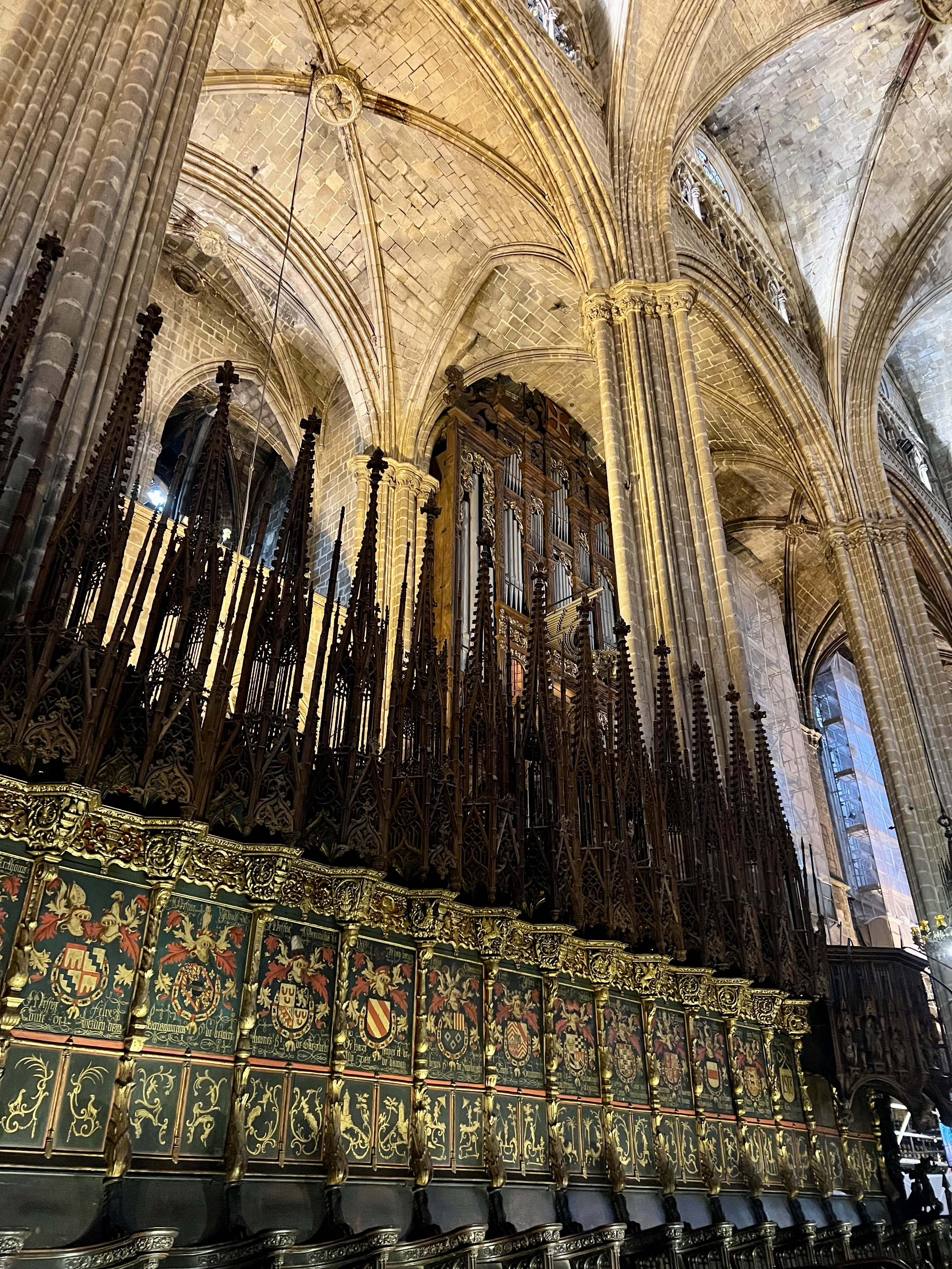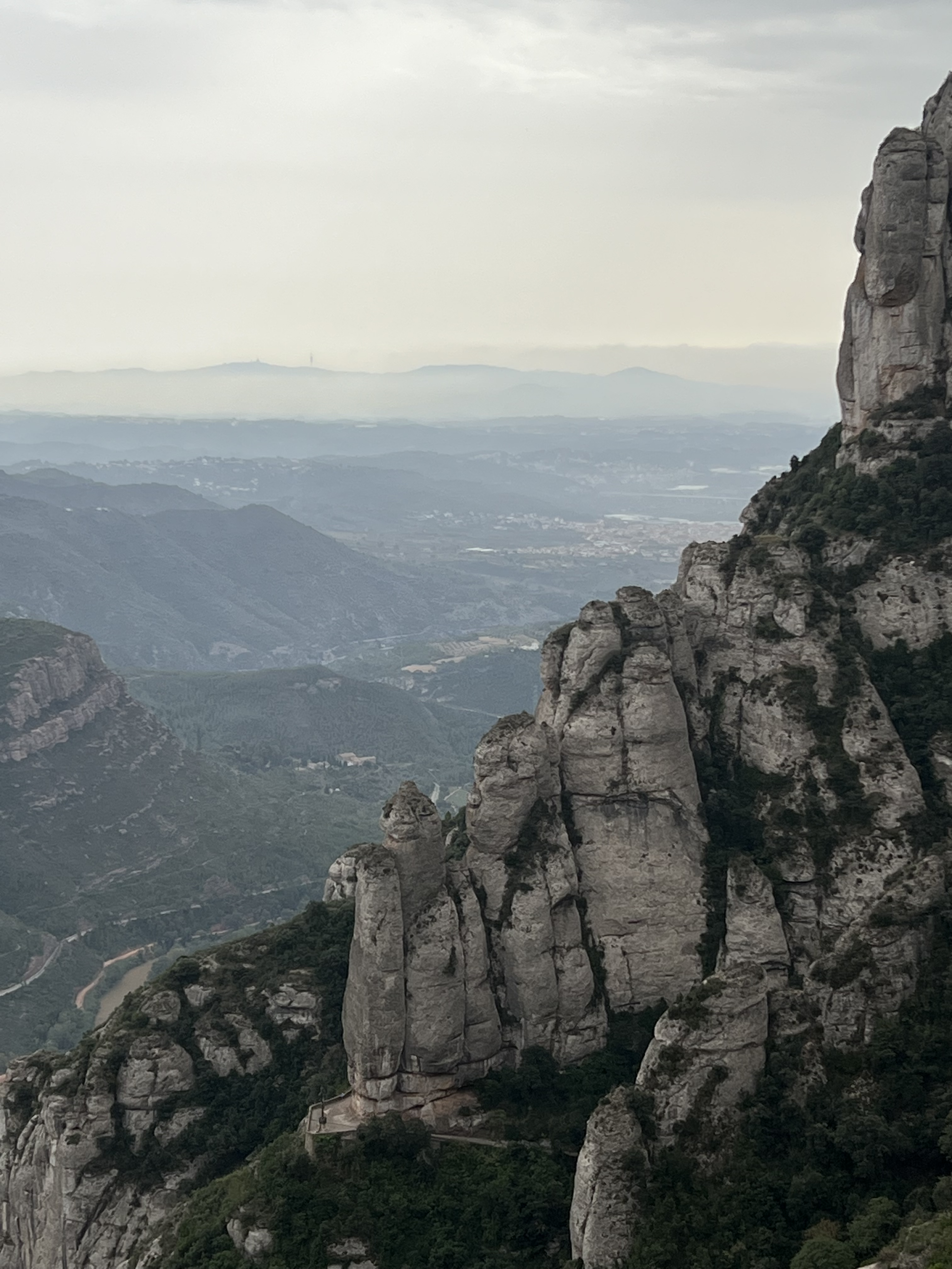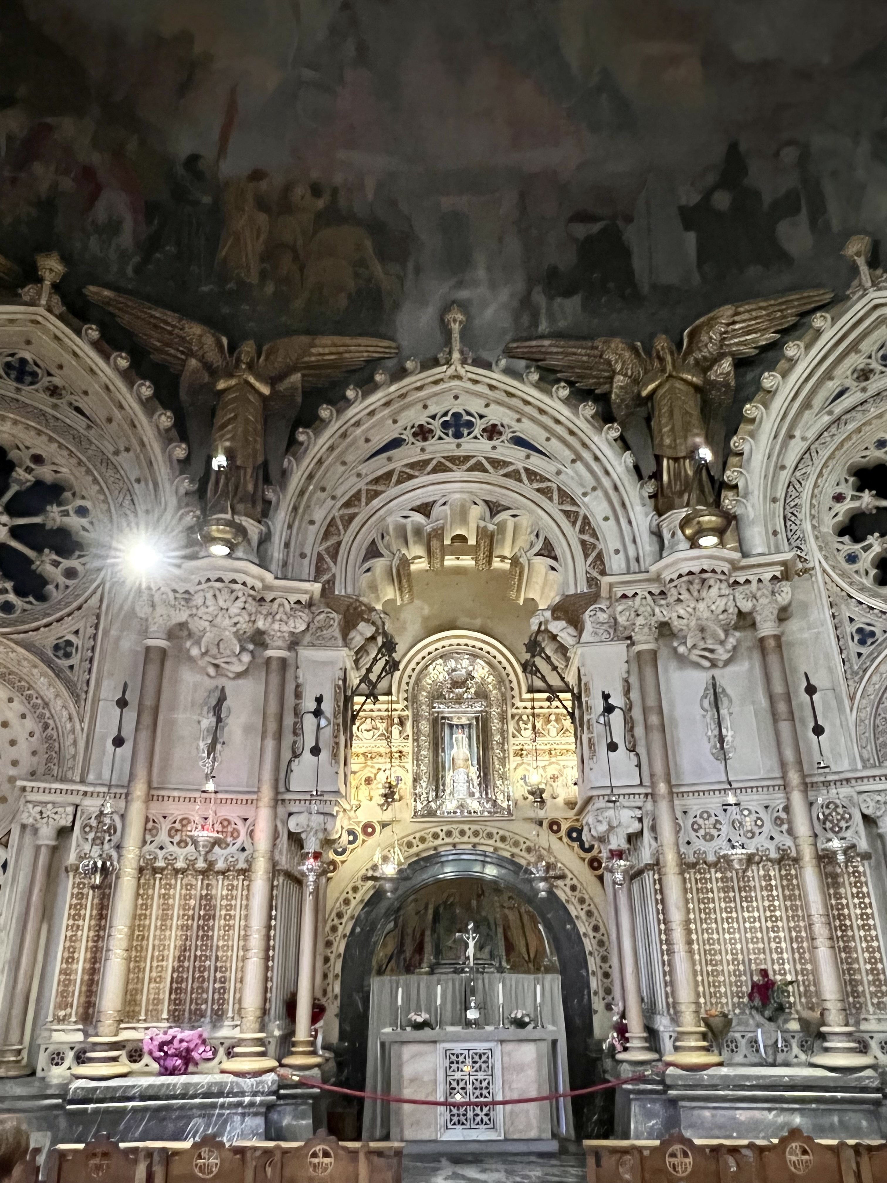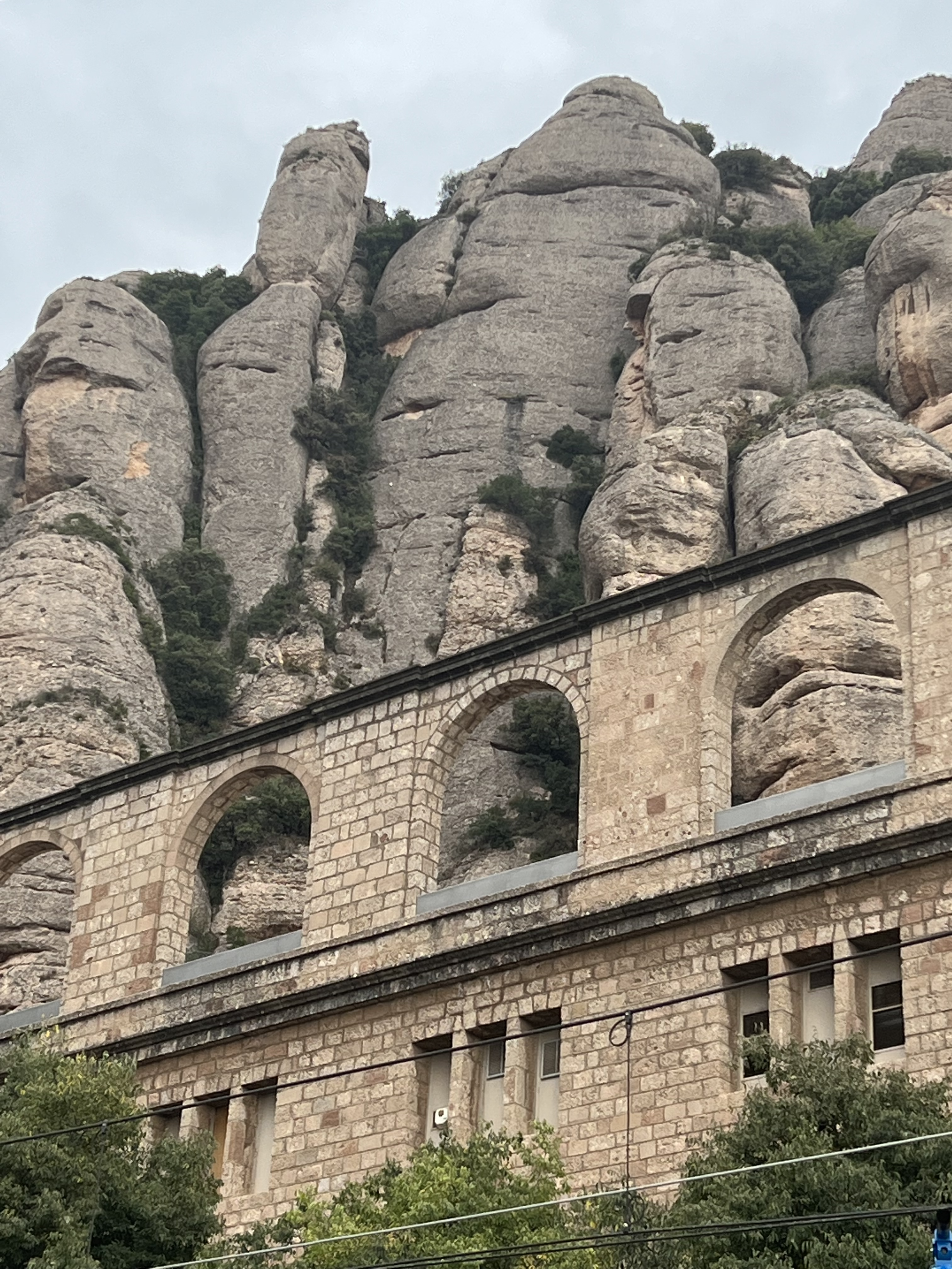 Kathy and I went to Montserrat, the mountains and monastery by that name outside of Barcelona. What a surprise as we were enthralled by what we saw. The mountains gave Gaudi his inspiration for his building designs. The mountains have pillars of stone that give the same melted wax appearance as his columns and the plants and vegetation of the mountains find their way into his nature designs. The views from the heights overlooking the hills and valleys beyond were amazing. However, it was the monastery that drew our undivided attention. We were pleased to experience the monastery boys’ choir, the most celebrated choir in Spain. The chapel is a jewel box of beauty as it is one of the most important sites in the nation. The chapel houses the famous “Black Madonna”—Mary and Baby Jesus. The vision of the madonna in the mountains drew visitors for centuries with Queen Isabella of Spain and St. Francis of Assisi being among them. Eventually the image of the Madonna was copied and carved from marble and the marble was black in color. Now pilgrims worldwide come to see the statue. We joined the throng. As we walked upward in long corridors leading to the statue not a sound could be heard. People moved forward in hushed silence. Even the walking was soft and quiet. Each room on the way was more exquisite than the one before. Craftmanship in wood, mosaics, marble, ceramics and paint was superb. The room housing the Madonna was gold and silver. Protectively housed in a glass enclosure, the Madonna holds an orb in her hand with Baby Jesus in her lap. A small portion of the orb is exposed so one can touch it. Behind the statue is a large beautiful chapel so that the Madonna can be viewed from behind. Outside the room are 1000’s of lit candles. We were thankful for the experience.