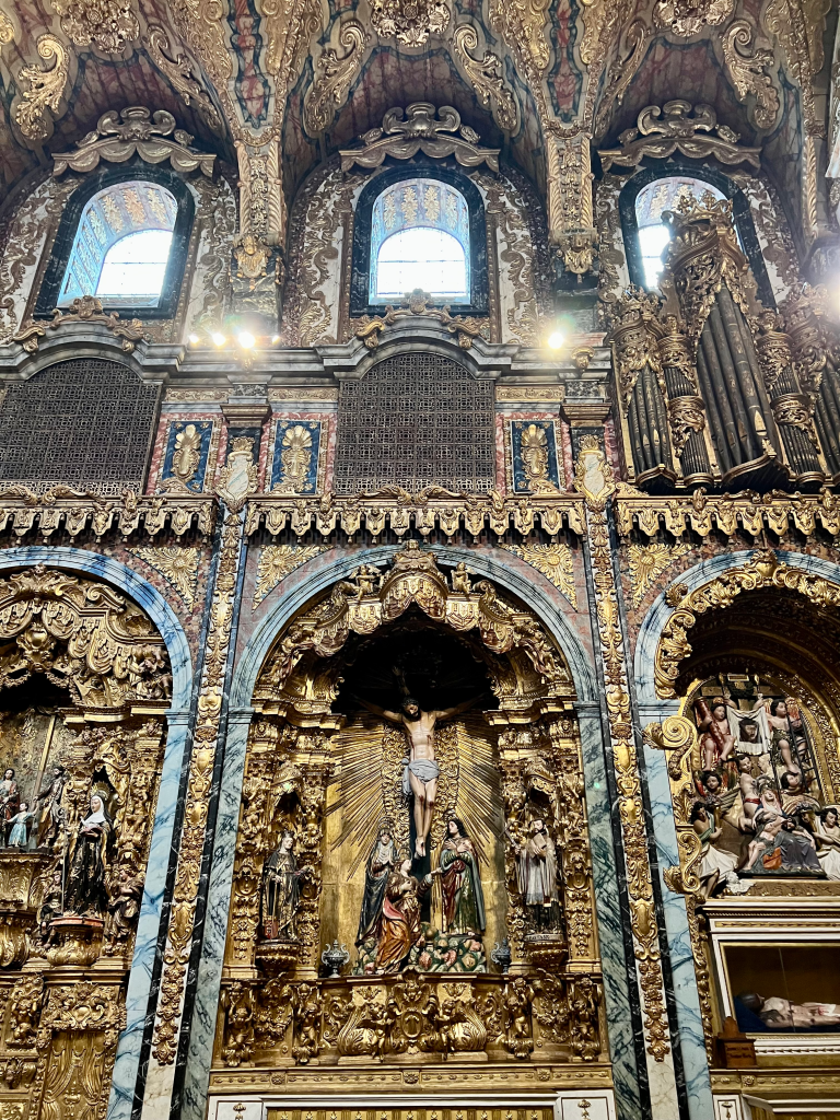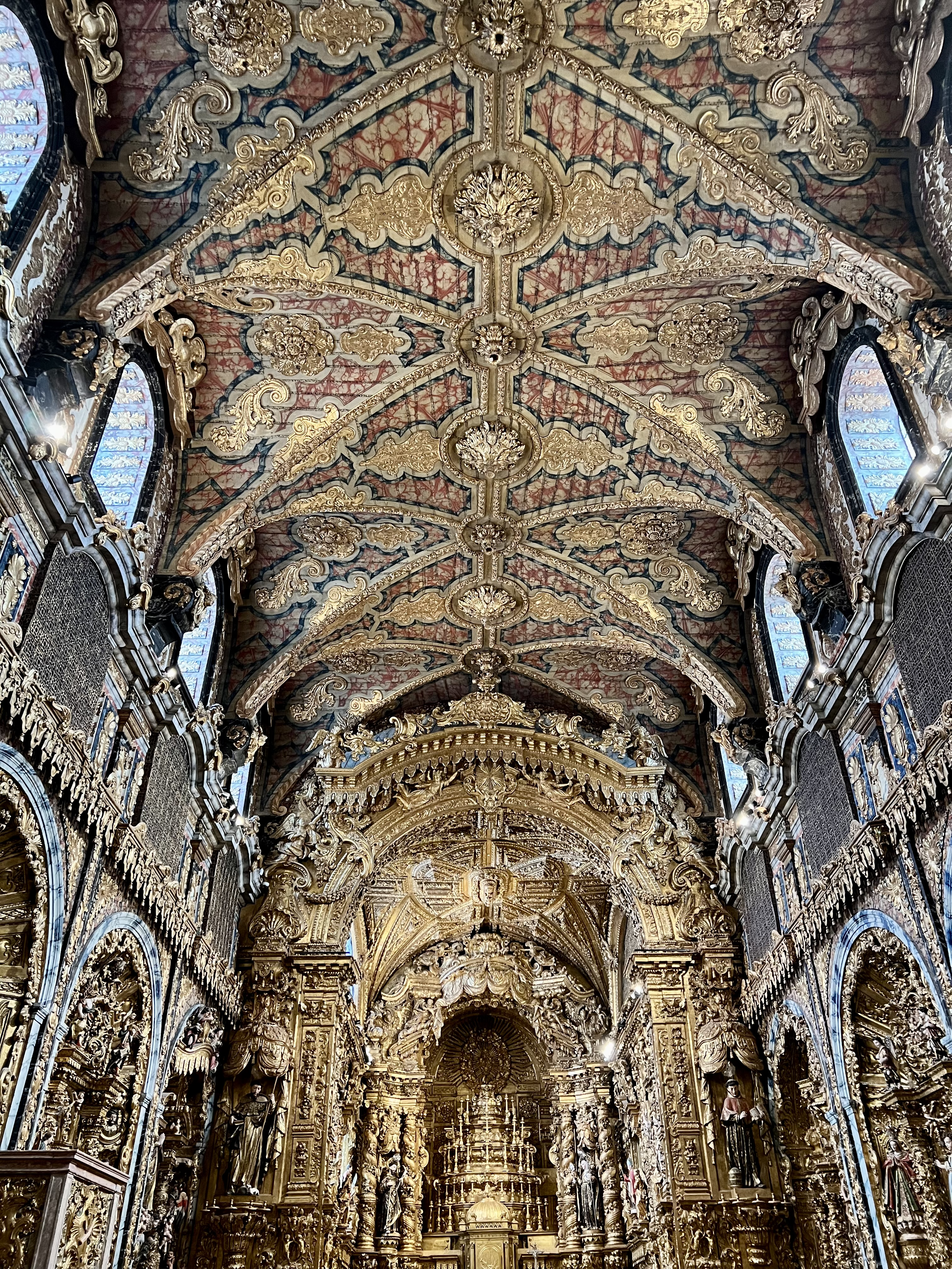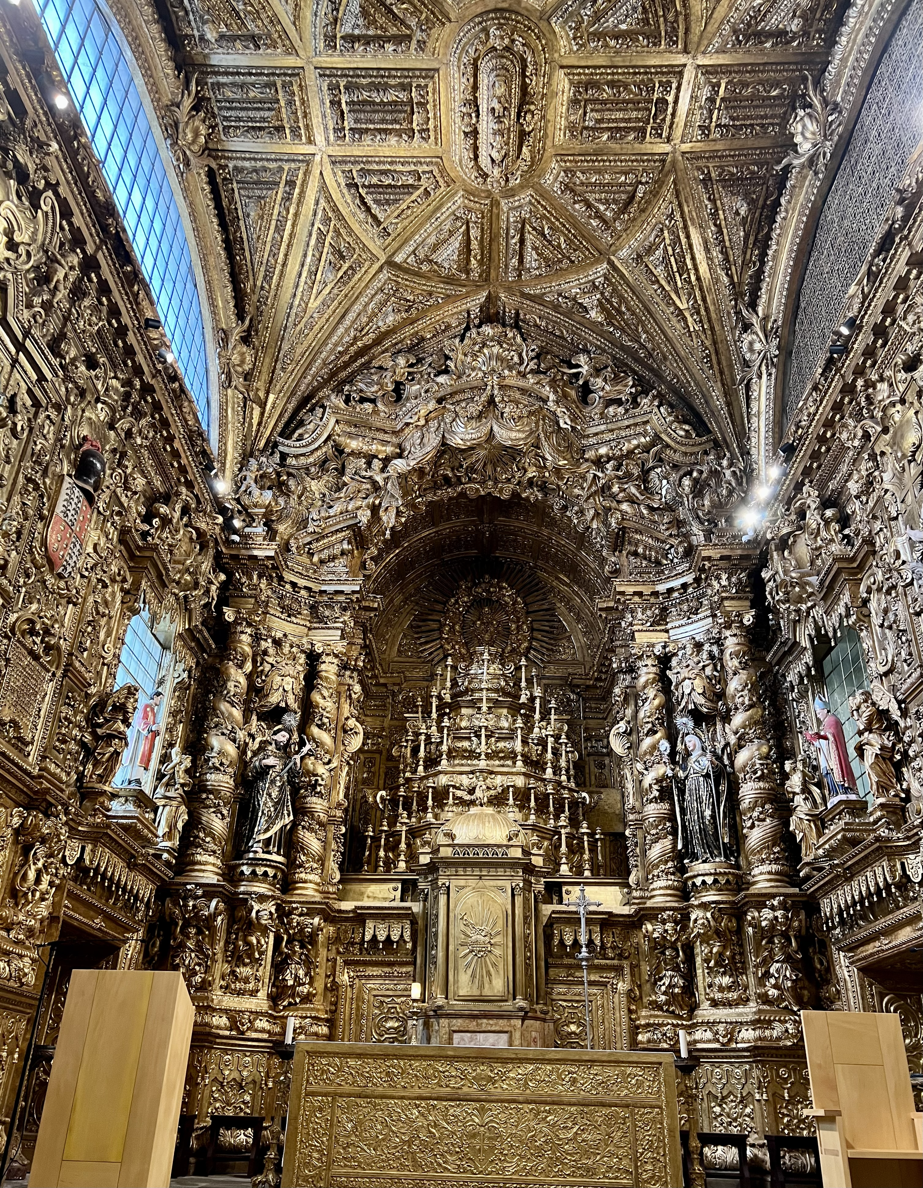 We added to our transportation venues by taking a bus from Santiago de Compostela, Spain, to Porto, Portugal. It was really our only travel option and it was comfortable and safe as we rode through the forested hills in sometimes heavy rain. Upon arrival at our awesome Porto apartment in a palace built in the late 1600’s, we set out to explore the city. Directly across the square from our apartment was the Santa Clara church. We were not prepared for the beauty we were about to experience. Really, the complete gold baroque interior took our breath away. Awesome to the max! Fortunately, the docent inside spoke English and told us that the church was in complete ruins after years of neglect; however, corporations and various organizations banded together to completely restore it to its former glory. He was one of the rebuilders/restorers himself and glowed with pride as he spoke of the precious history of the church.