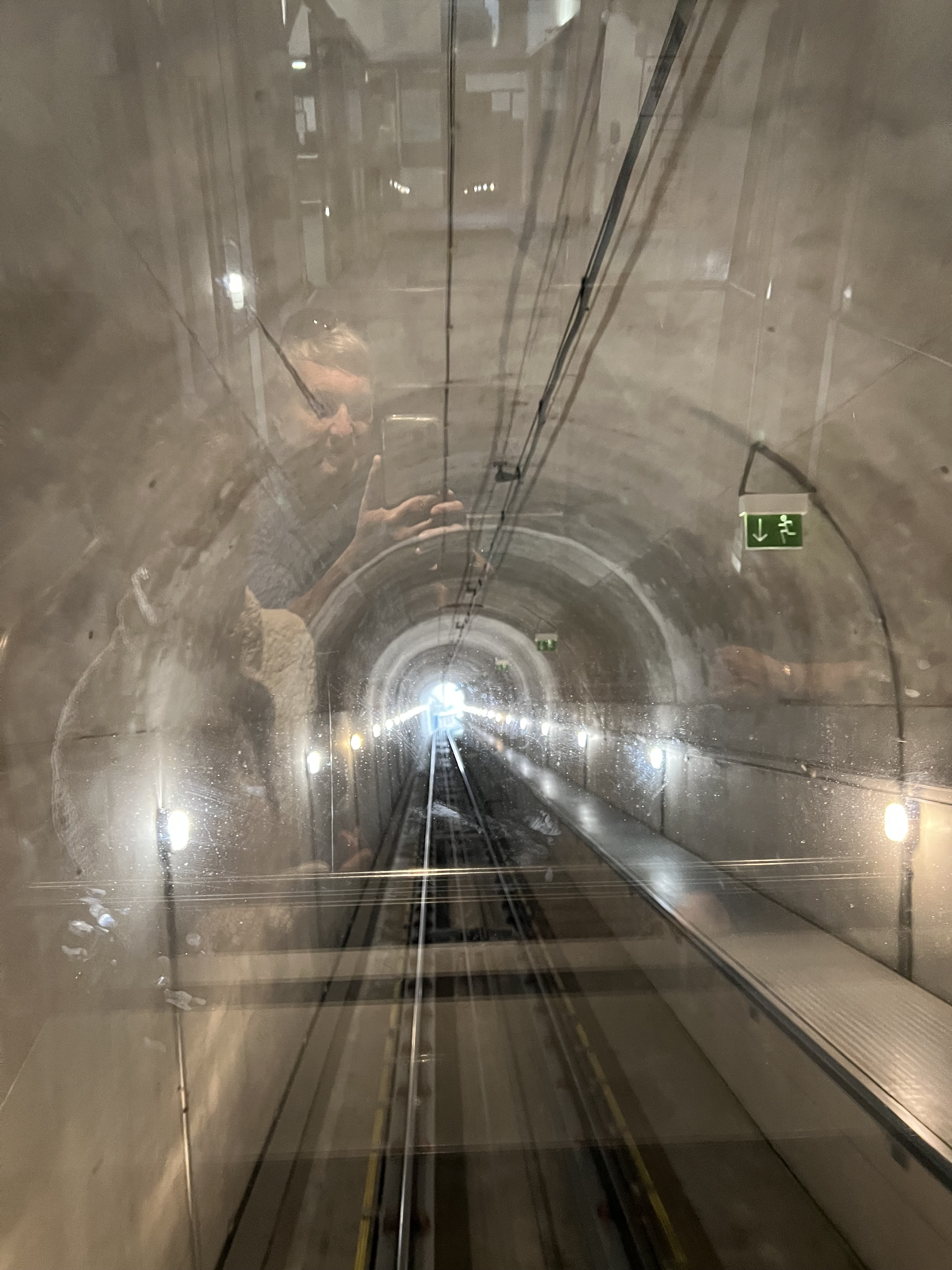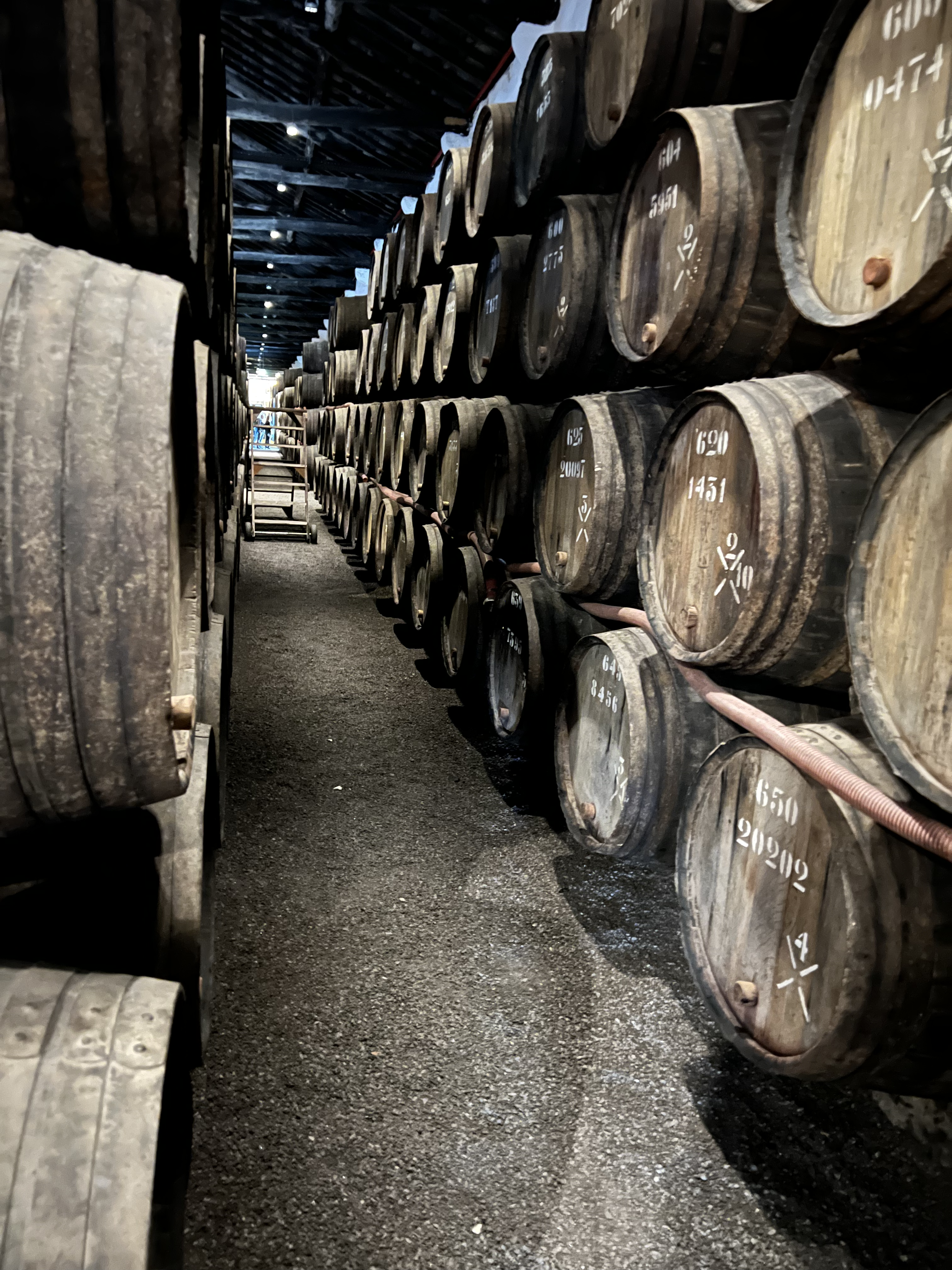 The next morning, after the rain had subsided, we headed out to the nearby famous bridge over the river Douro, designed by Eiffel of Eiffel Tower fame. Unfortunately, as we approached the bridge, the rain returned in spades! Here we were, on the top of a multi-tiered bridge, hundreds of feet in the air in a driving rain. My plastic rain tunic ripped in the blasts of wind that propelled the rain sideways. There was no way to stay dry and no place to find refuge. I started to laugh, because as soon as I thought it couldn’t get worse, it did! Melisa was behind me and said she could only watch my feet as she could look no where else but down. Once safely on the other side in a building housing the sky tram, Randy, Melisa, Kathy and I looked at each other in disbelief. We waited for the rain to pass to head back to the apartment to change clothes, take showers and reassess our plans for the day. As we approached the bridge we realized that the streets were flooded and all the transportation had come to a halt. So we waited some more for the flooding to recede. By early afternoon the sun was out and the weather was pleasantly refreshing. We ordered a cab to take us to the Taylor bodega on the other side of the river. Port wine takes its name from Porto and port vineyards line the Douro River outside the city. Taylor is the oldest of the port wineries. We really enjoyed the tour past multitudes of vats and barrels (one holding 140,000 bottles of wine) and relished the port tasting at the end. From there we walked down to the riverside and to the sky tram that transported us back up the hill to the bridge. This time we enjoyed the views from the long bridge on this beautiful afternoon. Once across the bridge we walked to the old train station, noted for its Portuguese tile interior, depicting historic scenes from Portugal’s past. From there we walked to the funicular that took us down to the riverside where there are many pastel-colored buildings lining the river, with historic port wine boats bobbing in the water. We ate in a wonderful restaurant specializing in Portuguese fare. We drank more port wine! We took the funicular back up the hill and got out right by our apartment. Porto is quite hilly, but with a funicular, a street elevator, and a sky tram, you don’t necessarily have to walk up many hills. We were very blessed in that our apartment was in the center of it all and a few minutes walk got us to most of the sites.
