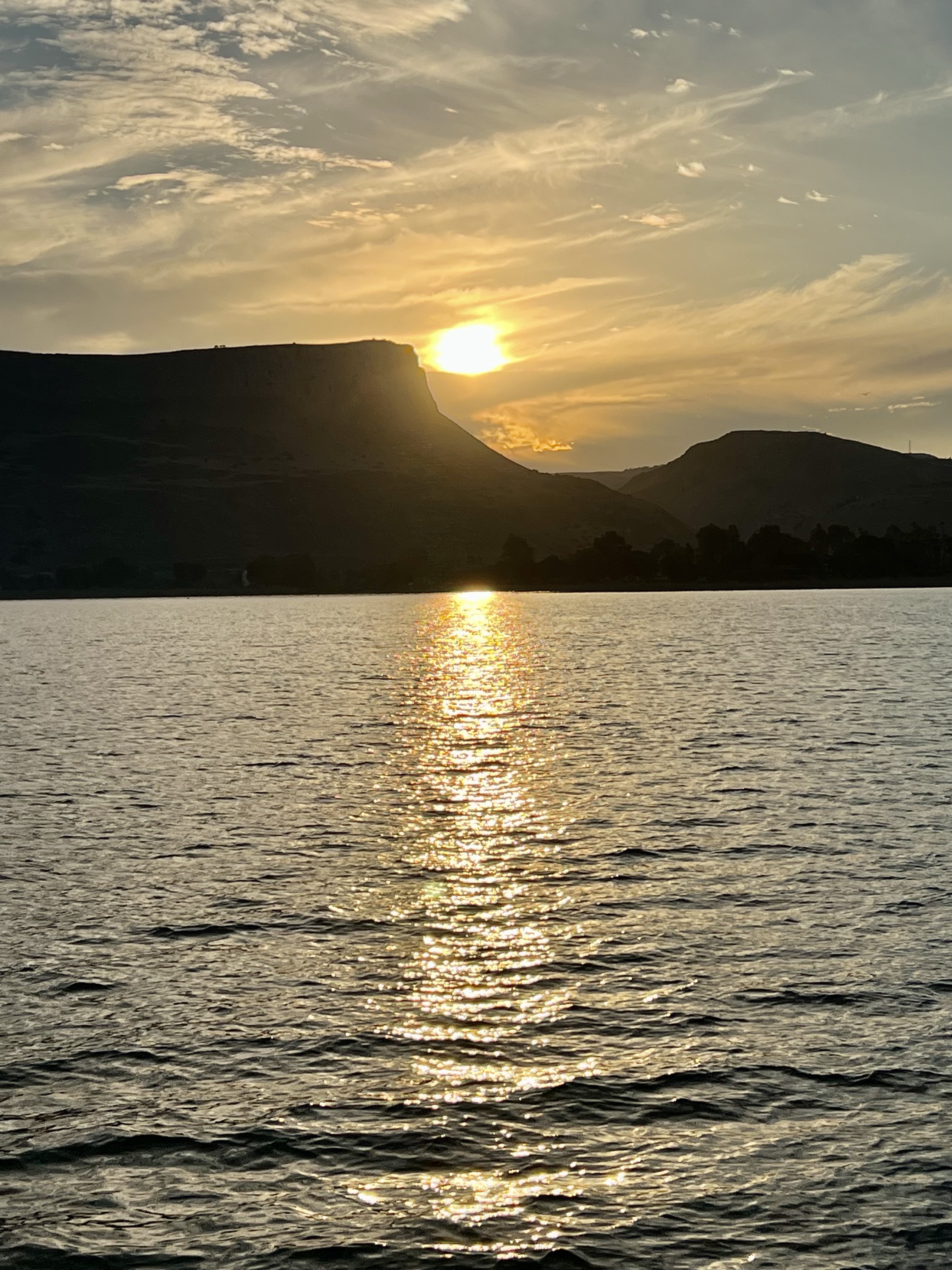 Then, as the light began to fade, we arrived at our fishermen’s boat for a ride on the tranquil Sea of Galilee. It was another awe-inspiring time as we viewed one Biblical site after another as we sailed the middle of the lake. Praise music played and we often burst into singing. The high hills that surround the Sea of Galilee provided a majestic backdrop to the deep blue waters, and the setting sun and flocks of birds that surrounded the boat couldn’t have been prettier. We danced and sang and meditated along the way.