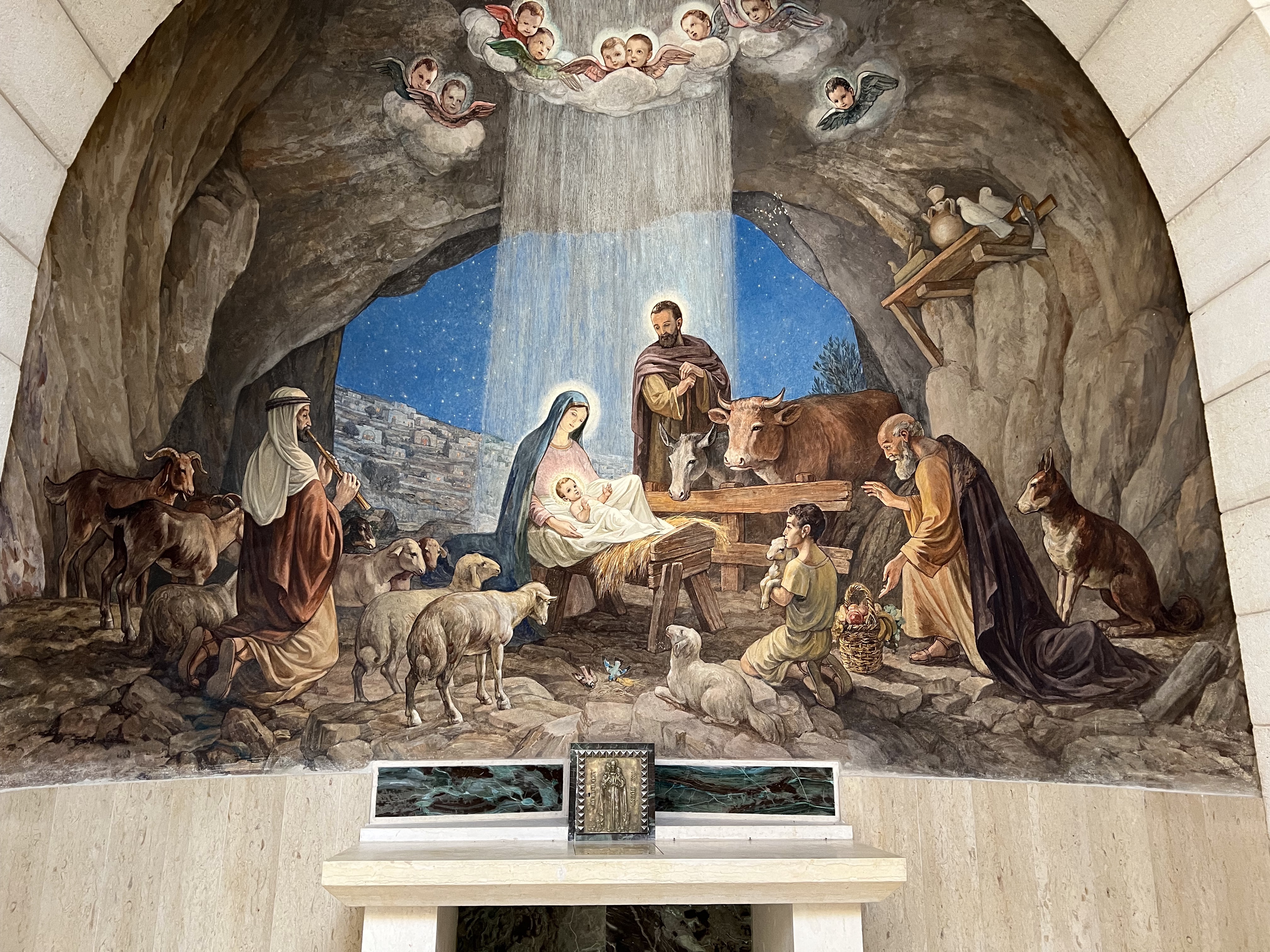 After breakfast, we took the very short ride to Bethlehem, the birthplace of Jesus. We first visited an artisan woodwork factory run by a Christian family. The Christian community is under duress in the Palestinian-controlled area. We watched artisans taking blocks of olive wood and turning them into beautiful objects, often religious in nature. We were able to visit the traditionally-accepted place of Jesus’s birth, a cave. One can crawl on hands and knees to touch the accepted place of the birth. Only a short distance away are the shepherds’ fields where the temple shepherds were watching their flocks at night when the army of angels appeared to them announcing the Savior’s birth. Up the hill is a church with phenomenal acoustics. Our rendition of “Angels We Have Heard on High” sounded beautiful.