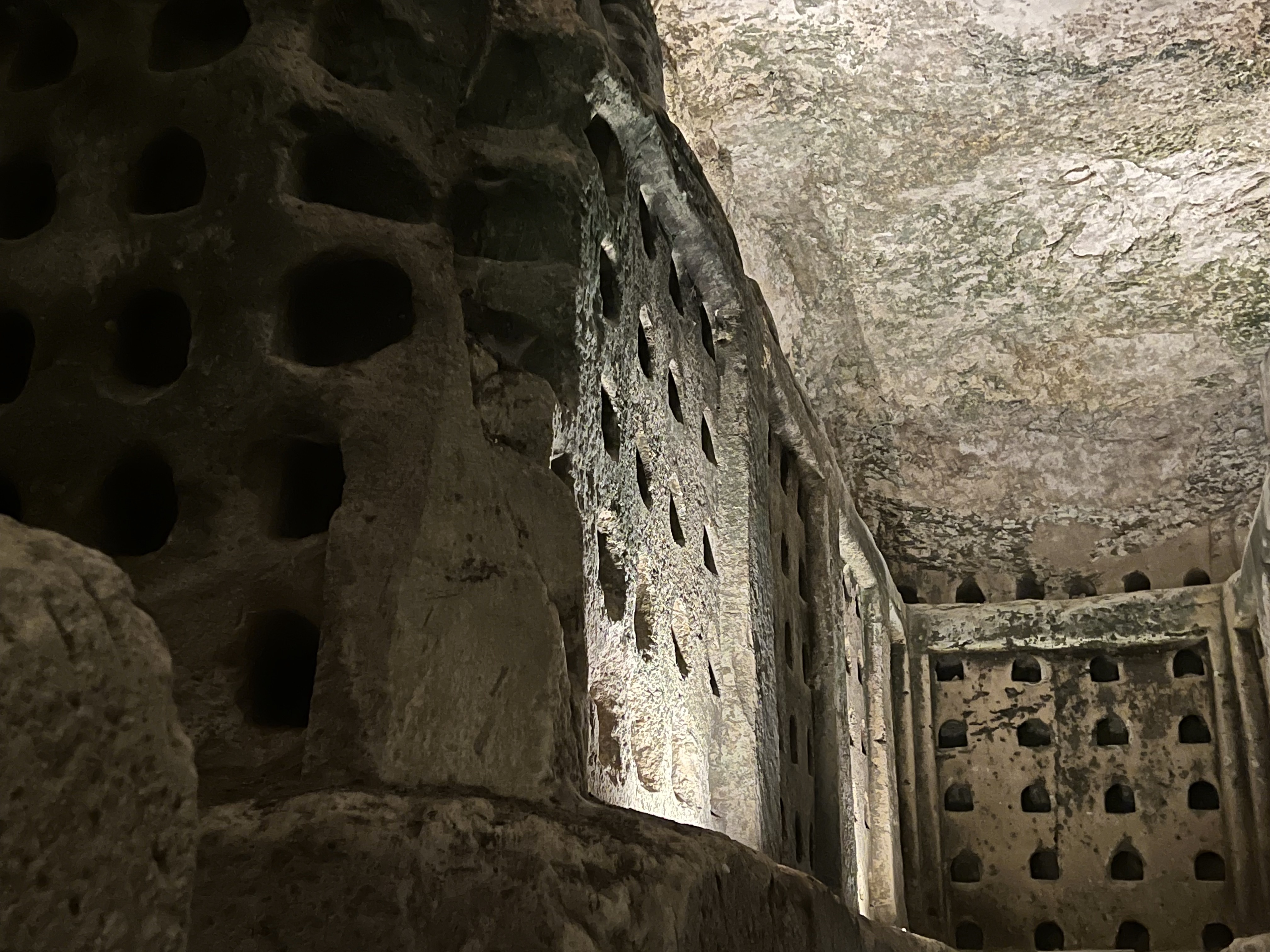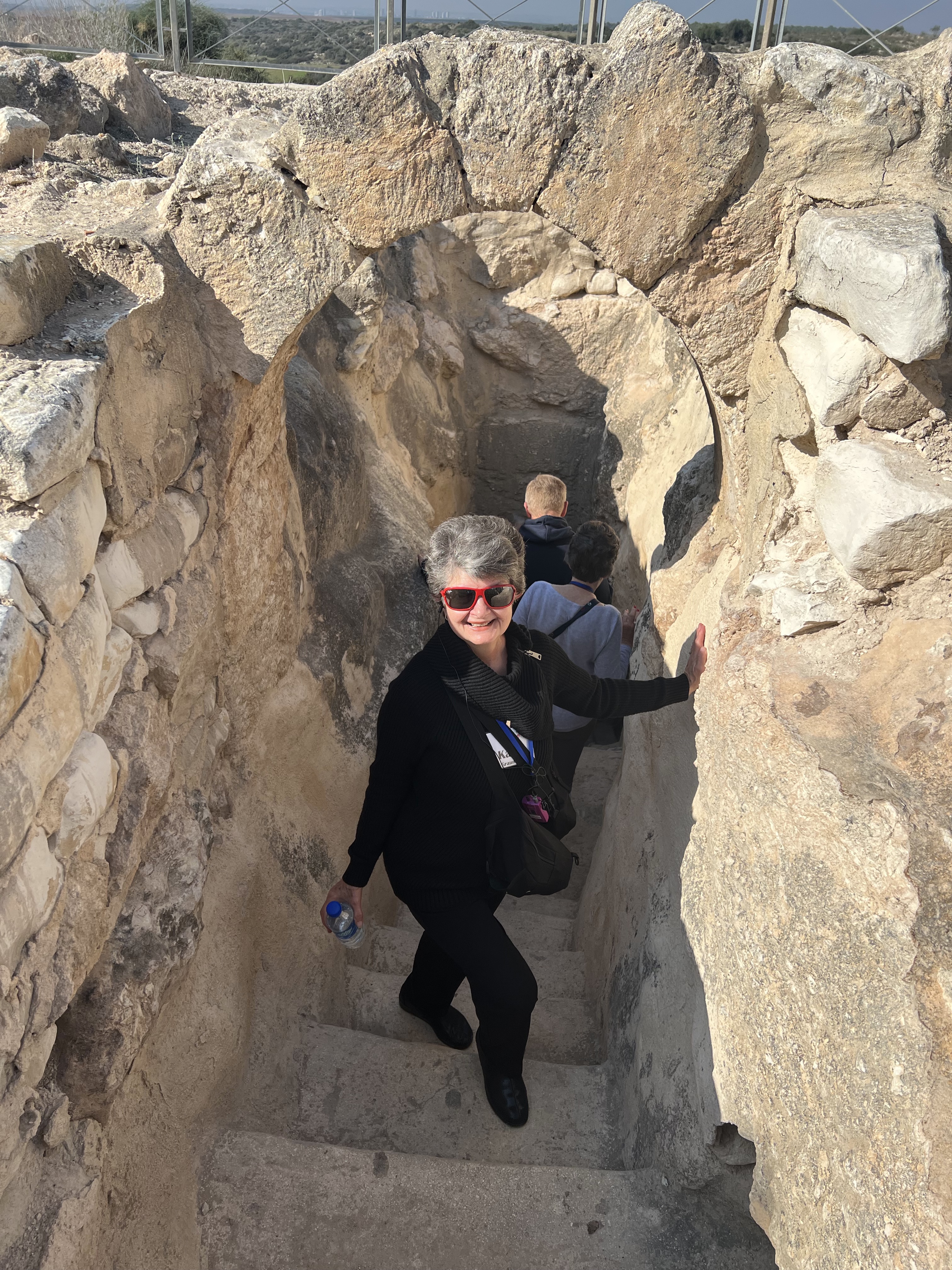 On our last day, our flight home was not until nearly midnight, Israeli time, so we had the day to make stops on the way to the airport. It was an awesome day. We visited two cave areas. The Dove Caves were caves carved underground in limestone that housed thousands of doves. Little dove houses were carved into caves where the temperature was conducive as a dove habitat. The area was on a major road into Jerusalem where pilgrims to the Temple would stop to buy their dove offerings for worship purposes. It is highly possible that Mary and Joseph stopped here when Jesus was twelve, and they were on the way to the Temple with Jesus.