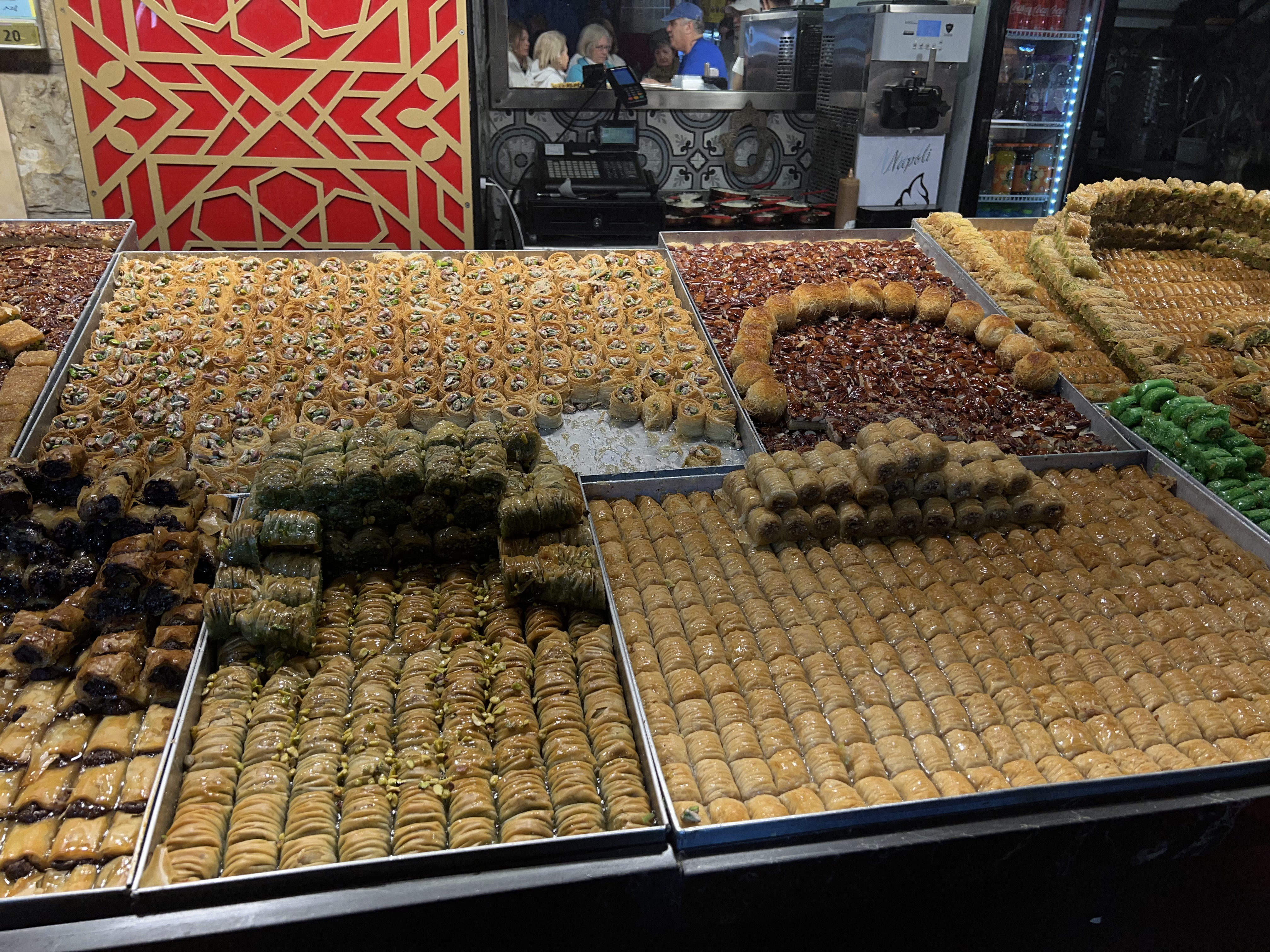 Our hotel in Jerusalem has been wonderful, with excellent food and lots of buffet choices. For breakfast, shawarma was a favorite of many. It has pickled vegetables in a tahini/hummus/tomato sauce covered with cracked eggs and baked in an oven.