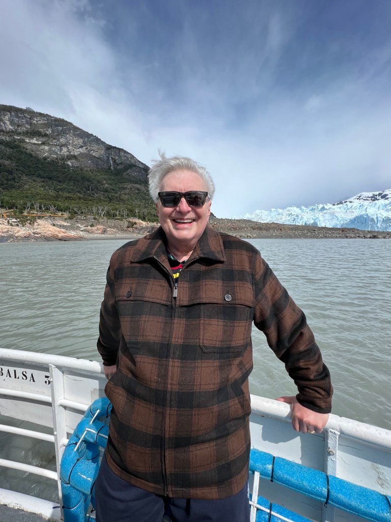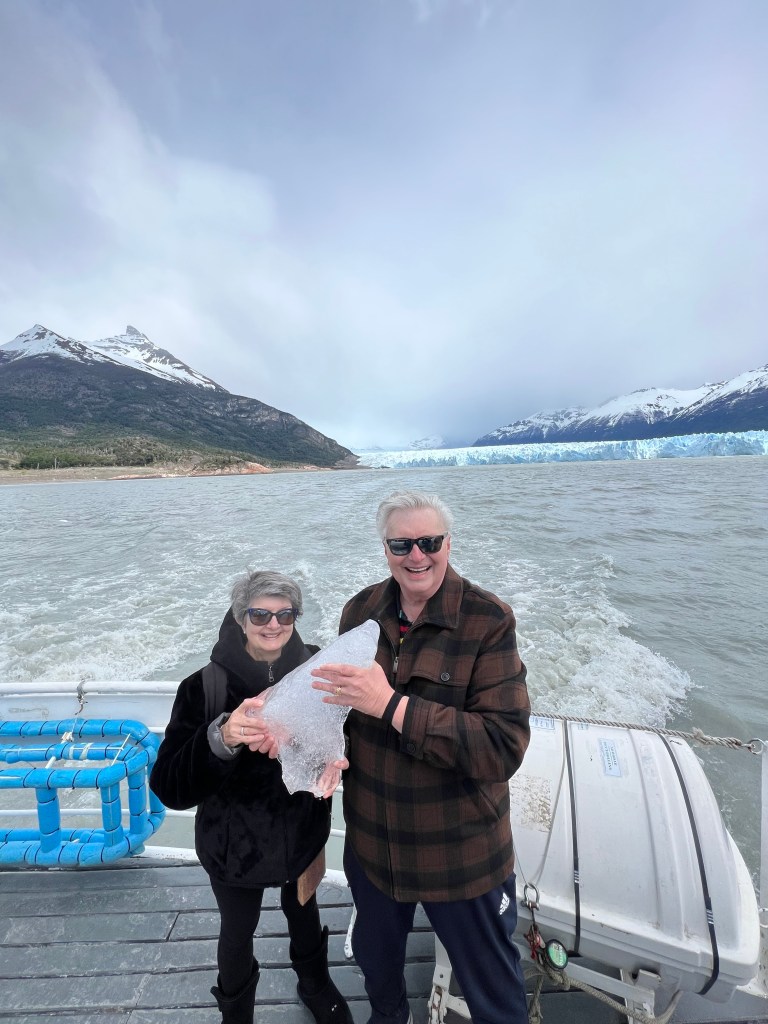 As we ascended, the plains turned into forests with pine and other native trees. Streams flowed down the side of the hills fueled by the snow above. After about 15 miles, we were zig-zagging upward into the Andes. As we approached the glacier Perito Moreno, the sights were amazing as the ice field with great expanse lay out before us. The ice field was nestled between high mountain peaks. On one mountain, a waterfall cascaded downward. Kathy and I had opted for a small boat to take us close to the glacier where it flowed into a huge river bay. We were happy that we had. The boat pulled so close that the blue of the ice was almost overwhelming. Kathy saw one calving of the ice into the water. Andean condors flew overhead. The boat turned parallel to the glacier and very slowly moved along the three mile wall of ice which is 560 feet thick. It was simply astounding! Vivid blues shown brightly and reflected on the clear white ice. Our national park guide told us there is no pollution in water or air in Patagonia. Thankfully, when I dangled Kathy over the side of the boat to scoop up some glacial ice, I didn’t drop her–so there is still no pollution.