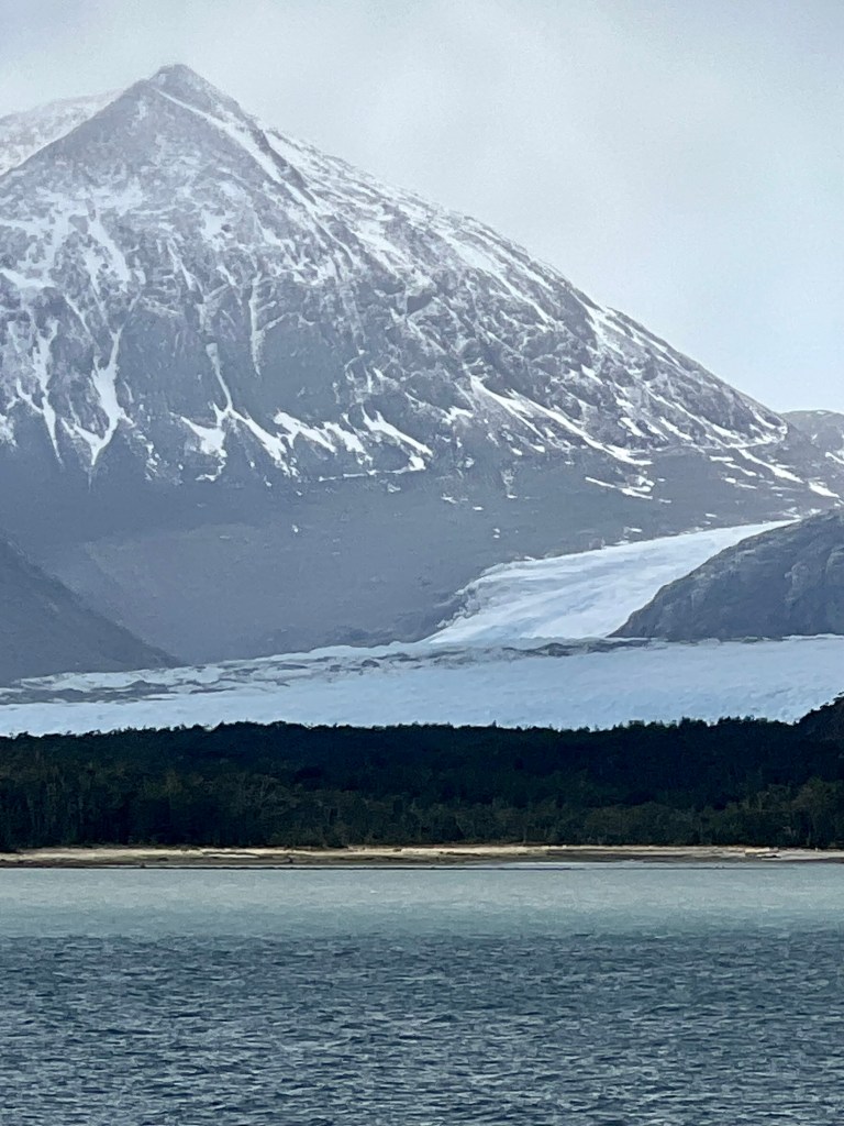 I didn’t have long because we were soon cruising through the famed Glacier Alley where six glaciers move down the mountains into the Beagle Channel. So large, most are named after countries–Germany, France, Italy, and Holland. The Channel is narrow and snow-capped mountains reach skyward; however, all the glaciers are on the same side. As Kathy and I sat in a lounge at the rear of the ship, a waiter brought us snacks and drinks. After a while, I realized the snacks and drinks matched the glaciers outside–beer and pretzels for Germany, champagne and cheese for France, pizza and wine for Italy, etc. Snow was falling outside. I picked this lounge because right outside was an observation deck where I could easily take photographs. The cruise was magical, the glaciers as impressive as beautiful.