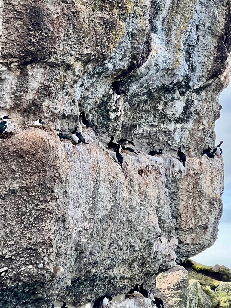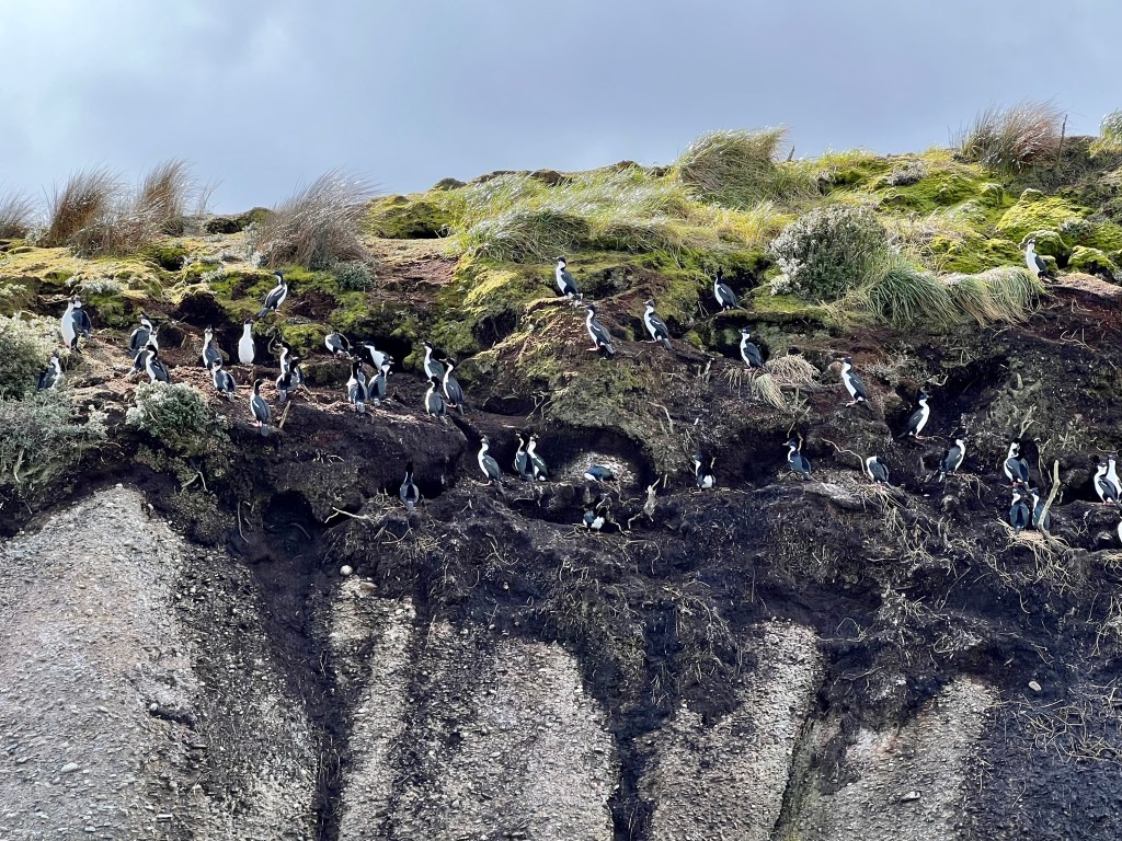 Right now only males are on the Islets preparing the nests for the mating season soon to begin. The females are still swimming and are located somewhere off the coast of Argentina. All the penguins winter (during our summer) near Rio de Janeiro, Brazil. As we zodiacked from islet to islet, we saw more and more penguins. The islets are a preserved area, so we could not set foot on them; the penguins were only a few feet away. They are not afraid of humans. The Tucker Islets are a bird preserve and we saw colonies of both Imperial Cormorants (they look like penguins but can fly) and Magellan Cormorants who nest in the cliff sides.