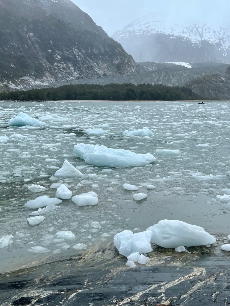 It was cold and snowing and the Beagle Channel in which we cruised was filled with ice. The zodiac popped up and down with the waves as the driver tried to miss large chunks of floating ice. Pia Glacier is noted for the constant rumbling and thunderous sounds it makes as the ice moves to the Channel. It is one of the world’s fastest moving glaciers. It also calves often and I was fortunate to see that happen twice. The first calving caused a large wave. As we turned to walk back to the zodiac, it began to sleet. Driven by the wind, it stung as it hit the face. Once back on the ship, I was thankful I had braved the elements and happy to take a hot shower.