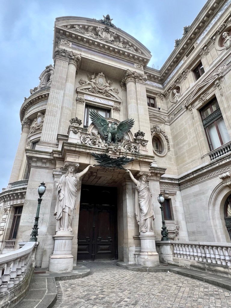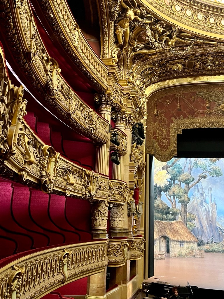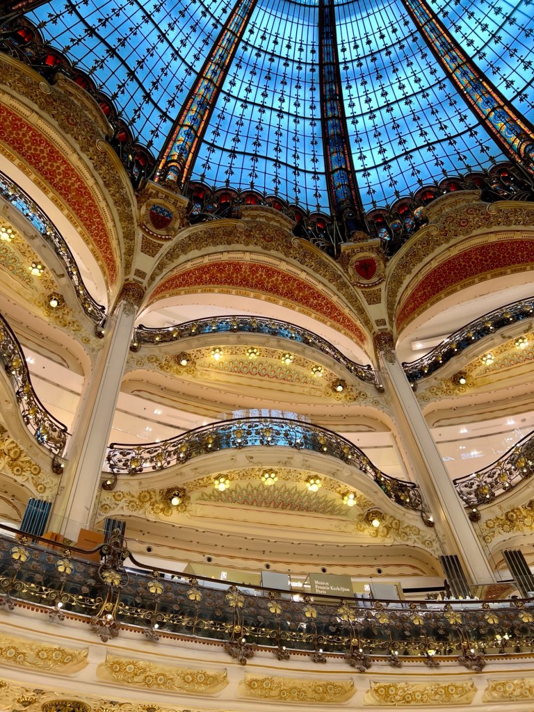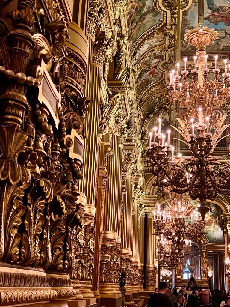 On Thursday, we ate breakfast. Our hotel is very well located, so we walked to our day’s destinations. The Palais Garnier, the Opera House, was spectacular! Multi-tiered with exquisite tiles and mosaics, huge golden statuary and brilliant chandeliers blended into a golden hall with beautifully painted ceilings. The opera hall itself was resplendent.