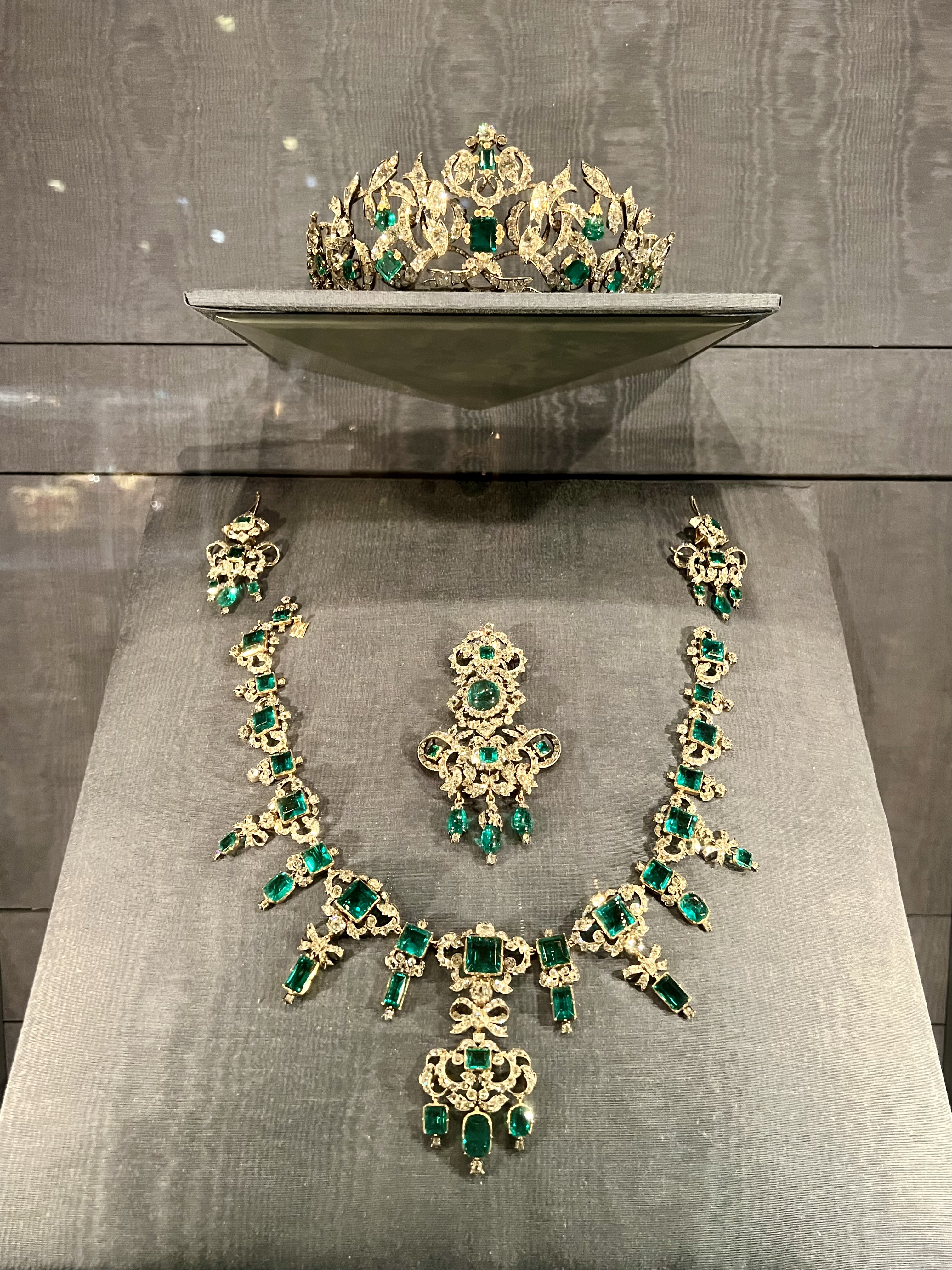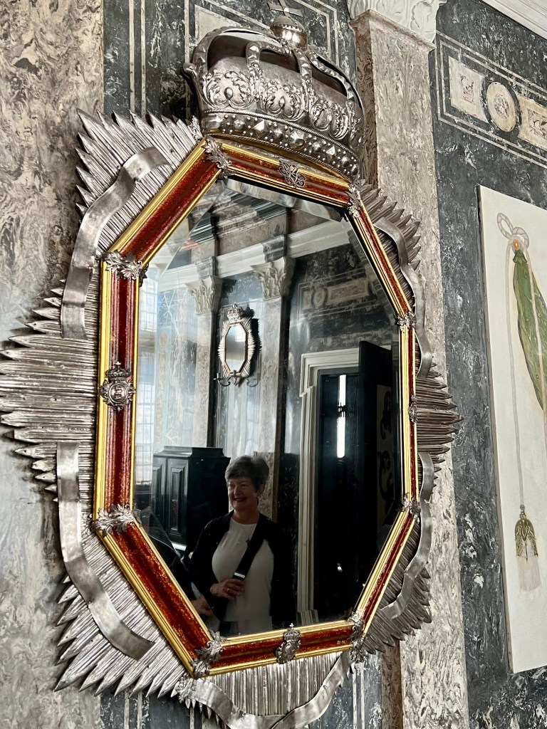 Today, a Sunday, was a wonderful day. We ventured into the central city and toured Rosenborg Castle with its beautiful turrets reaching high into the sky, home of Danish Royalty over the centuries, and now a state museum. Filled with tapestries and painted flooring, the castle sits in a grand park and botanical garden. The Great Hall features large silver lions in front of the royal thrones, and the basement contains the royal jewels, ceremonial garb and crowns of the monarchy. Rather dazzling! We walked the short distance from the Rosenborg to the Amalienborg Palace, home of today’s royal family of King Frederik X. The palace consists of four nearly identical Scandinavian Renaissance buildings surrounding an octagonal plaza with an equestrian statue of King Frederik IV in the center. Fur-capped soldiers stood at attention around the plaza, and the state flags flew indicating the monarch was in residence. It is obvious that Copenhagen is upscale in a very comfortable and livable way. Parks abound, and well laid-out bike lanes are filled with folks out to enjoy the area. We laughed when we saw a young couple–woman biking and man in a large basket in the front (just the way it should be–a male chauvinist might say). I will look for one when we return home–Kathy insists! Sea air and breezes grace the lanes of handsome Danish-designed modern buildings amidst old Scandinavian Renaissance architecture. We enjoyed walking and understood why the people of Denmark are consistently rated the happiest people on earth.