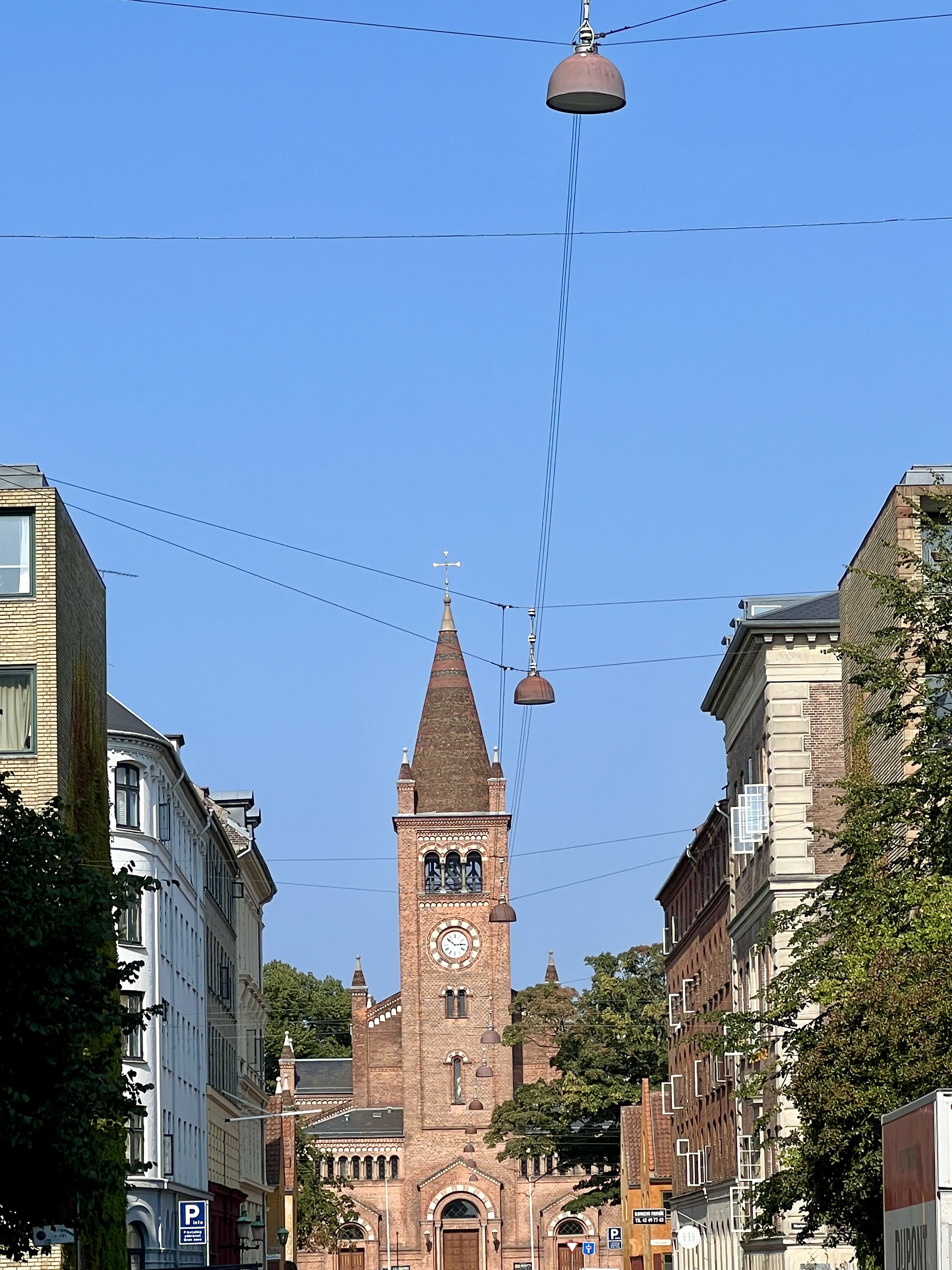 I noticed the lights as soon as we left the Copenhagen airport–suspended canisters hanging above the center of the roads everywhere our taxi drove–no lampposts. The clean appearance mirrored the cleanliness of the city. Our Marriott was situated on an island connected with walk bridges to an area of restaurants and shopping. We were tired from a long day of traveling and were thankful for a comfortable bed. As I dozed, I dreamed of the air flight into the city from Frankfurt, Germany. As we flew over Denmark, I noticed the many islands of this far north archipelago–green forested islands and beautiful plowed fields, each farmstead ringed with trees marking the owner’s land. Fall is in the air and temperatures are in the 70’s daytime. I noticed some yellow in the trees, and we saw vines turning magenta.