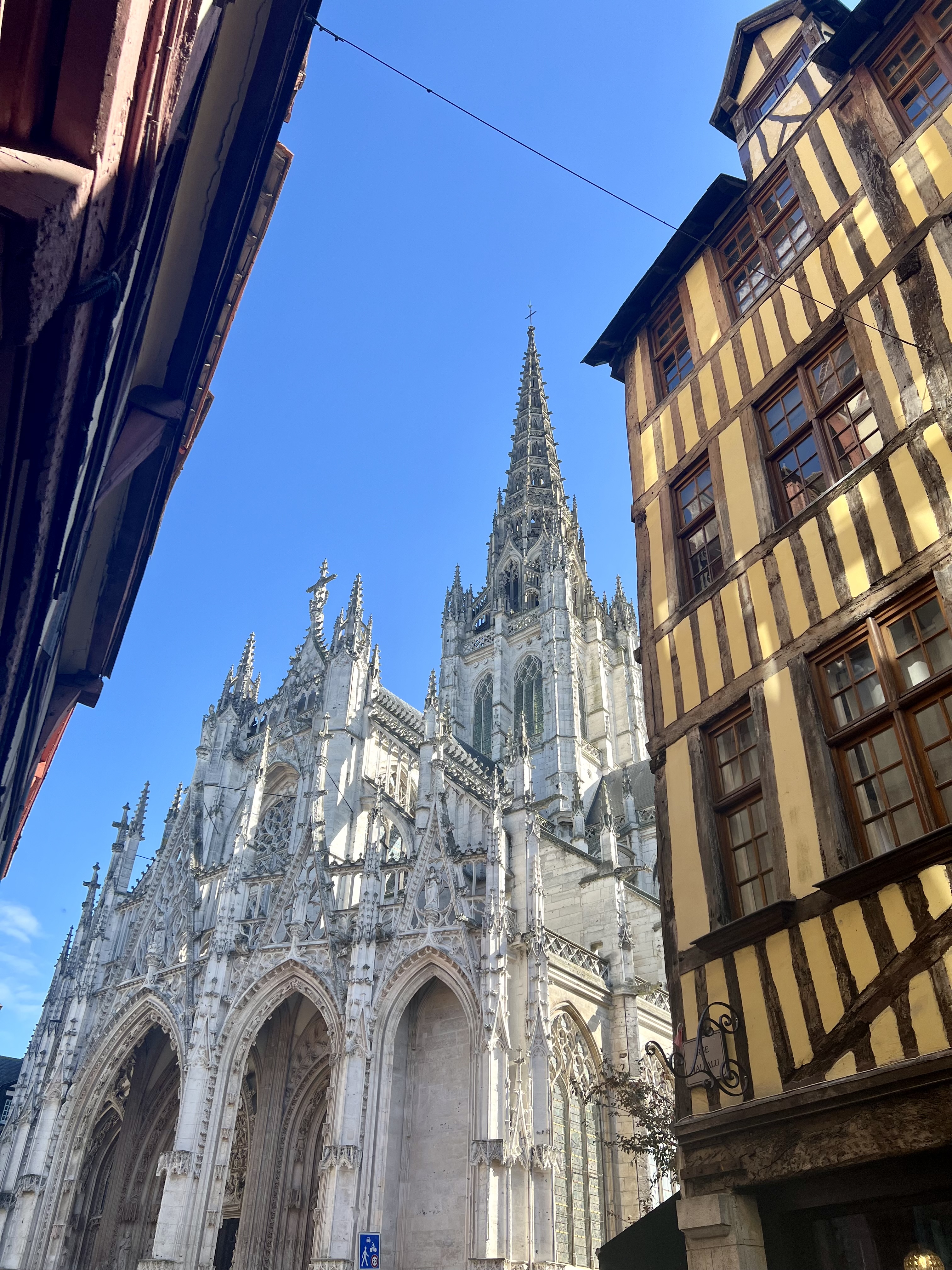 We had been to Rouen, France, several years ago, and I was determined to return! We have not been disappointed! Rouen, like many cities in Europe, has a cobblestoned medieval center. There is something special about Rouen. Its half-timbered buildings stand proudly . Almost around every turn there are gothic spires and massive gothic buildings clad in marble. Bells peal regularly. The Roman Catholic Notre Dame cathedral is immense, and its many entrances have amazingly delicate statuary on the portals. Rollo, the great Viking warrior and first Duke of Normandy, is buried within. His Royal line influenced history over and over again. One would think that with such a large church there would be few others in the vicinity; however, within easy walking distance other huge churches appear. They are all beautiful. Hotels and government buildings are interspersed and have appealing architecture. High-end department stores and small speciality shops along with outdoor cafes and bistros add to the city’s charm. Rouen is a special place!