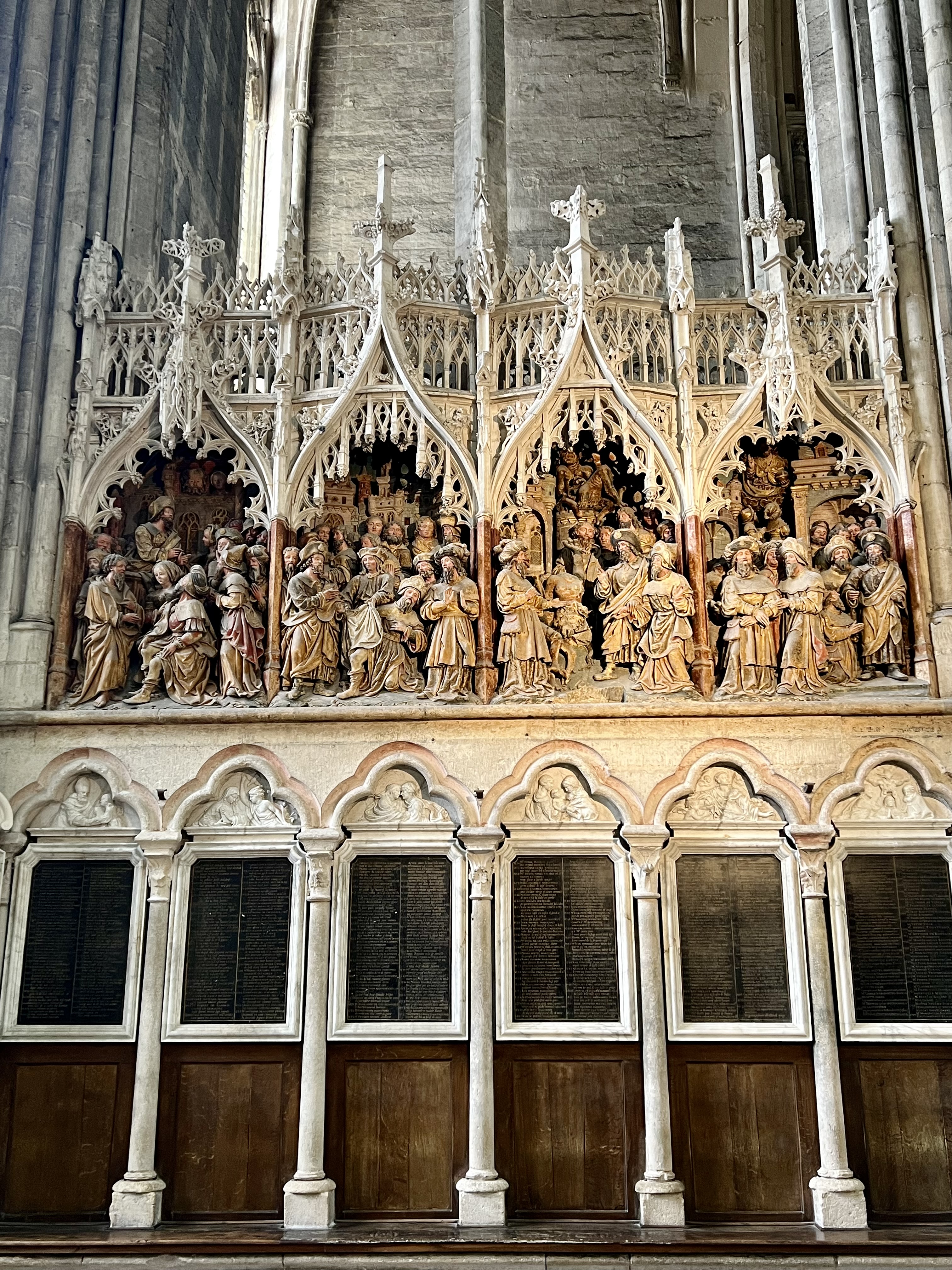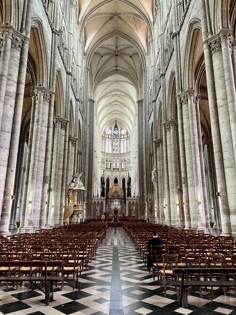 We arrived in Amiens, and our hotel held our luggage for us since we arrived so early. We walked immediately to the Roman Catholic Cathedral of Notre Dame, the largest church building in France. Imposing, yes, but also beautiful! The entrance portals are stunning with hundreds of statues of Biblical characters and scenes. They are as beautiful as any we have seen, if not more so. The interior is daunting, with massive side aisles that are larger than many cathedral’s main aisle. The main aisle is immense and tall. Transepts sweep to the sides and numerous large chapels line the whole interior. We were informed that Paris’s Notre Dame could easily fit inside with room to spare. It was Sunday, and most everything was closed; however, we found a Bistro open near the cathedral, and its special was quite appealing–roasted chicken in a tasty sauce, salad, and frites (French fries). We ambled back to the hotel and checked in for a relaxing night.