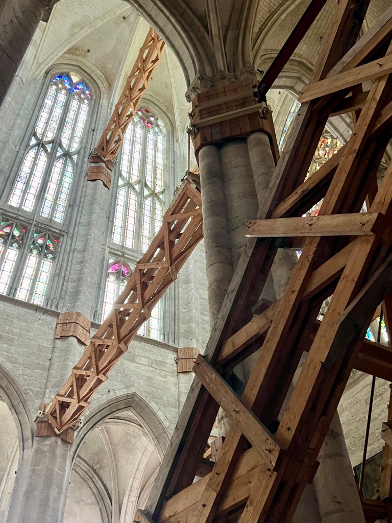 I was somewhat in trepidation walking into the Roman Catholic Cathedral in Beauvais, France. One could see how a patchwork of bracing keeps what remains standing. The cathedral is both imposing and sad. The vision was to build the largest cathedral in France, possibly even the world, back in the 13th Century. Construction began quickly and effectively and soon a transept and the choir (altar and music area) arose. It was majestic–the highest interior height (still to this day) achieved in the gothic form. Then, one by one, calamities struck. Part of the 154 foot high vaulting over the choir collapsed and repair work took needed funds from other projects. The nave was never to be built because of a fateful decision to build the highest spire ever conceived over the altar before construction on the nave began. Sure enough, reaching 492 feet in height, the spire made the cathedral the tallest building in the world until it began to move and finally collapsed in 1537. If the nave had been built first, as originally planned, it is highly possible the spire would not have fallen. Wars, especially the 100 Years War, came and went, and funds dried up. Then, during the French Revolution, anti-clerical elements destroyed the statuary that was a hallmark of the exterior, and interior treasures in the cathedral were hauled away. Later, the Beauvais Cathedral became a patchwork as efforts were made to conserve what remained.