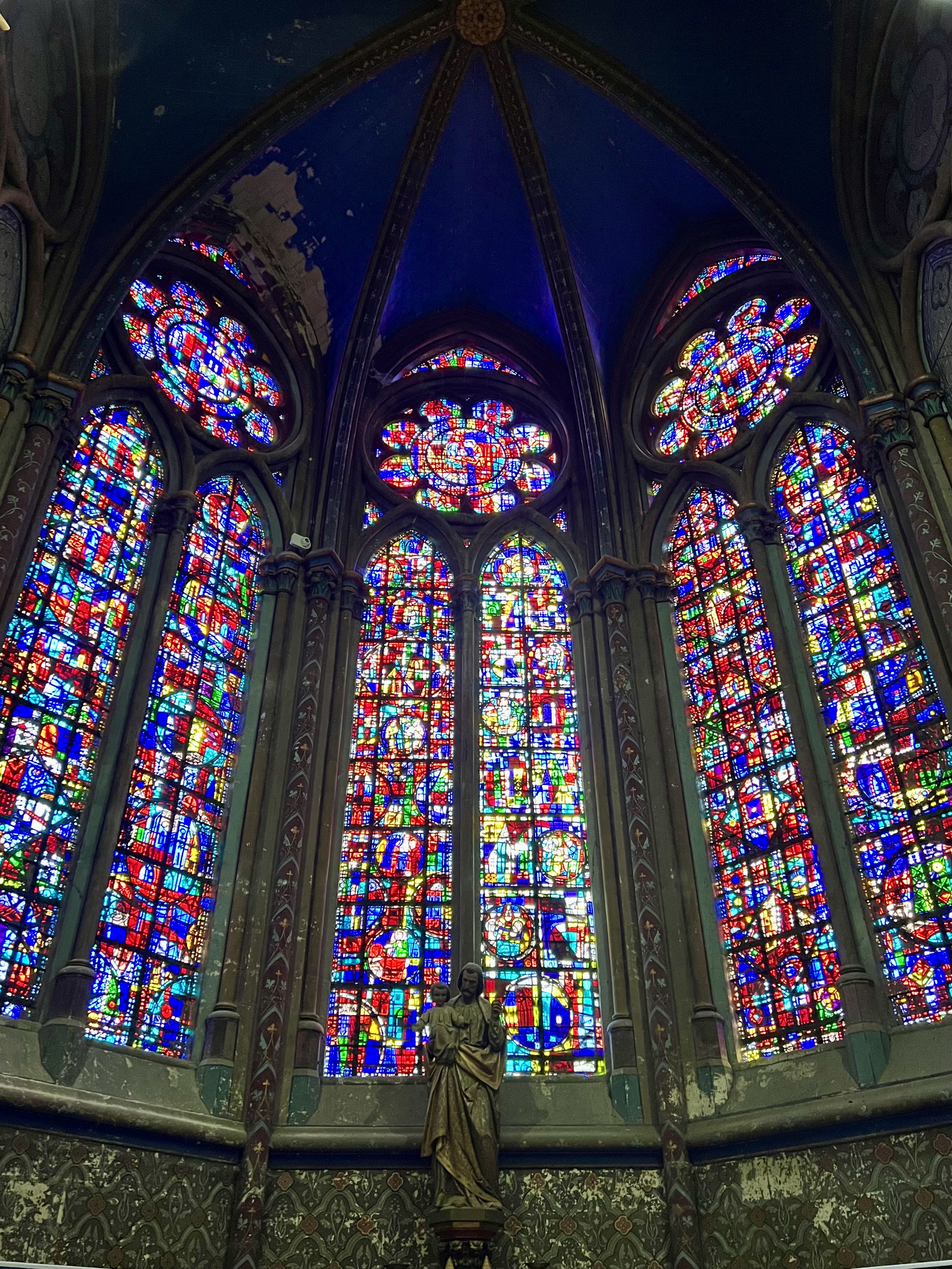 I was somewhat in trepidation walking into the Roman Catholic Cathedral in Beauvais, France. One could see how a patchwork of bracing keeps what remains standing. The cathedral is both imposing and sad. The vision was to build the largest cathedral in France, possibly even the world, back in the 13th Century. Construction began quickly and effectively and soon a transept and the choir (altar and music area) arose. It was majestic–the highest interior height (still to this day) achieved in the gothic form. Then, one by one, calamities struck. Part of the 154 foot high vaulting over the choir collapsed and repair work took needed funds from other projects. The nave was never to be built because of a fateful decision to build the highest spire ever conceived over the altar before construction on the nave began. Sure enough, reaching 492 feet in height, the spire made the cathedral the tallest building in the world until it began to move and finally collapsed in 1537. If the nave had been built first, as originally planned, it is highly possible the spire would not have fallen. Wars, especially the 100 Years War, came and went, and funds dried up. Then, during the French Revolution, anti-clerical elements destroyed the statuary that was a hallmark of the exterior, and interior treasures in the cathedral were hauled away. Later, the Beauvais Cathedral became a patchwork as efforts were made to conserve what remained.