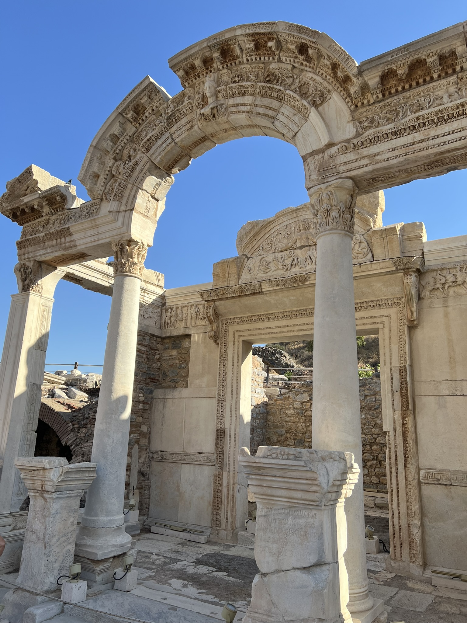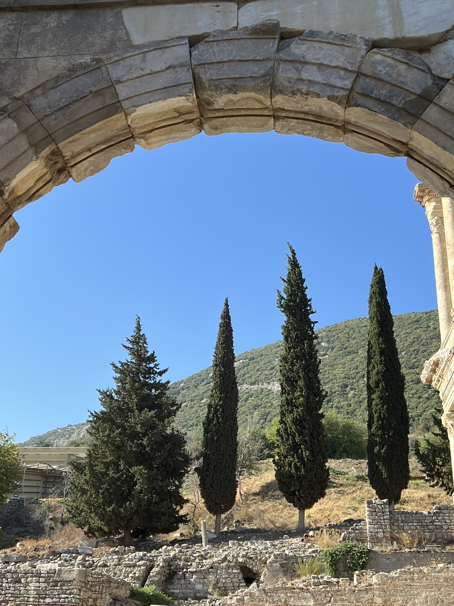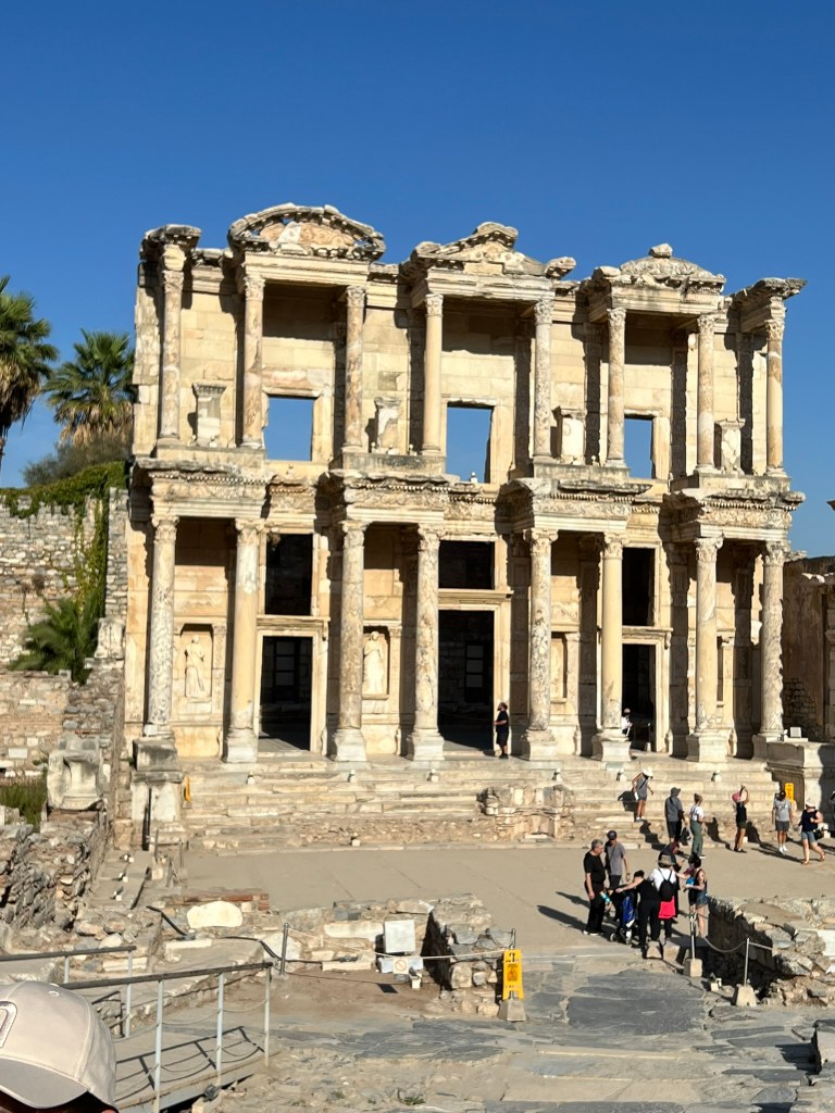 Our cruise of the Greek Isles and Istanbul (two days) and Ephesus in Turkey has been delightful. The white (lime) washed cities, often lining the mountainous cliffs overlooking the clear blue and turquoise waters below, were enchanting. Blue-domed Greek Orthodox churches dotted the heights and old Greek windmills added a unique aura as we walked the hand-laid smooth stone lanes. Istanbul was impressive, and our group of friends frequently commented on how clean and “beating expectations” it was. The Blue Mosque, however, was less than I expected. Still, the intricate blue tiles were beautiful. The Hagia Sophia, the ancient and magnificent Christian Church, was faded glory since so much of it is covered over inside. It is now a mosque and any mosaics with human images that can be seen by worshipers are covered over since Islam forbids such imagery in worship spaces. Ancient Ephesus, where the Apostle Paul was persecuted and where an early Christian congregation was founded, has magnificent ruins. Stone columns line the 3000 year old stone street that leads the way to the proudly standing tall Library of Celsus. Two amphitheaters, one seating 25,000, draw attention. It is hard to believe that 80% of the city has yet to be excavated.