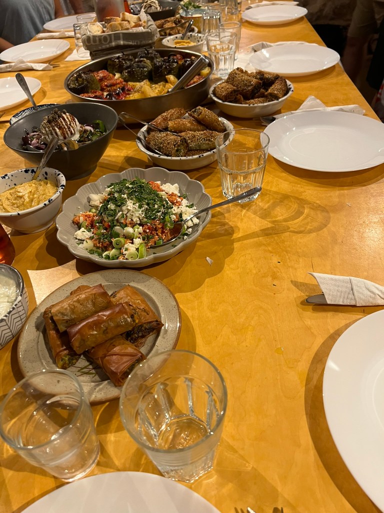 One evening meal, we walked to a highly recommended restaurant near our hotel. My whole squid—tentacles and all—stuffed with feta and tomatoes was supremely delicious.