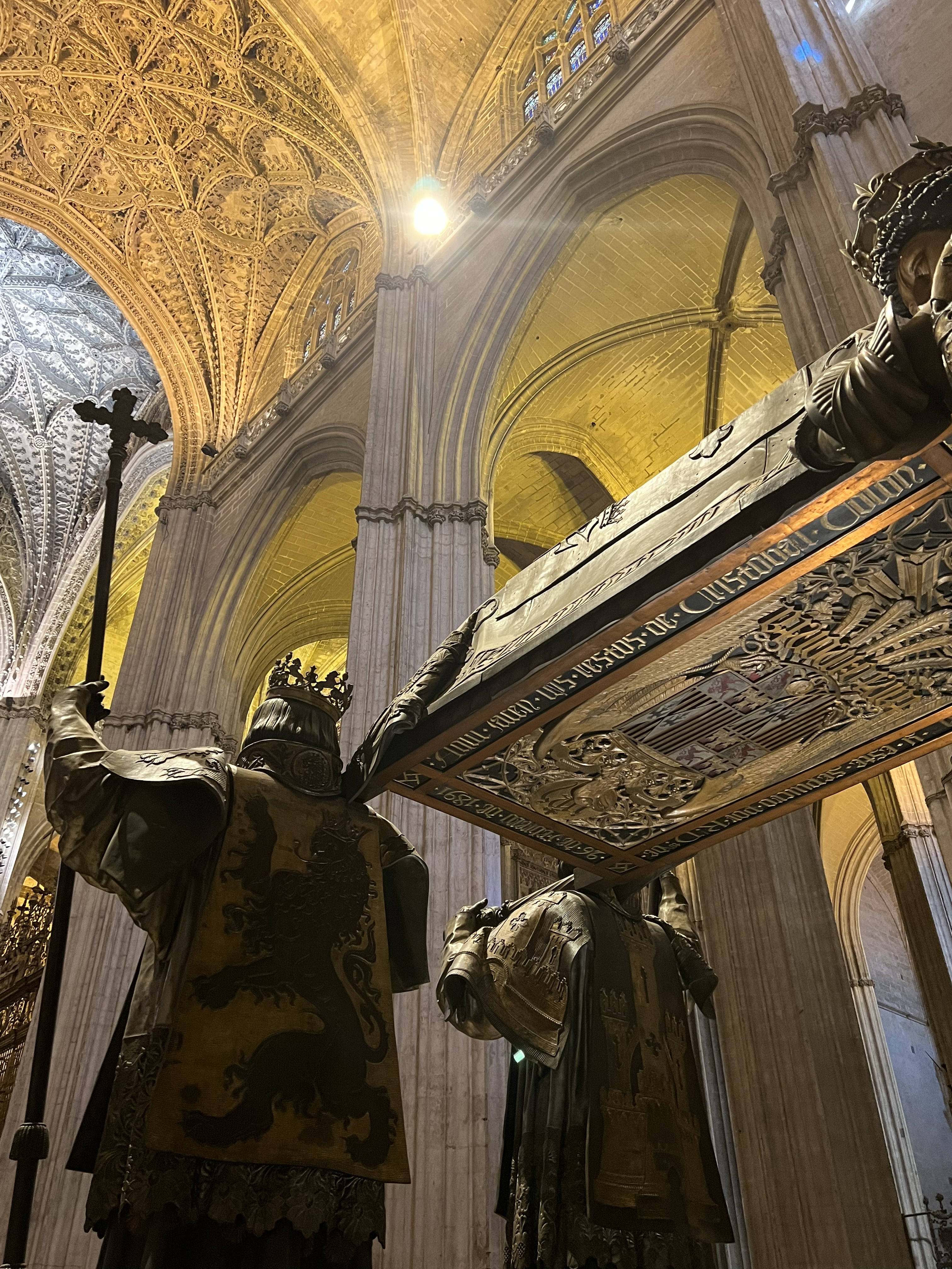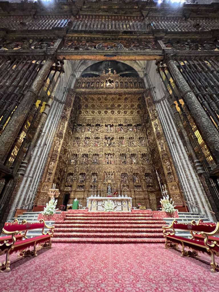 The majestic Seville Cathedral with its soaring Giralda Tower is a sight to behold. The largest gothic building in the world, dwarfing most other cathedrals in Europe, sits surrounded with large fountain-filled plazas and beautiful buildings. Its massive front entry with tiers of sculpted Biblical figures is only opened for the Spanish King and the Roman Catholic Pope. First, a church, and then a mosque during the Moorish conquest, and once again a church after the Reconquista—although greatly enlarged—one can spend hours in awe inside the building. Its immense altar of wood and gold with a solid silver altar table in front is considered the most beautiful in the world. We were fortunate to arrive to hear the pipe organ and attend mass. While we did not understand the words, it was beautiful, and the huge iron gates in front of the altar were opened affording us an unobstructed view. Christopher Columbus’s grave with a casket carried by four larger-than-life bronze soldiers—representing the four regions of ancient Spain—sat to our right. Later, we spent much time in the cathedral visiting the 80 side altars, themselves richly ornamented. The pipe organ is contained in two large towers in the center of the cathedral, each tower with huge pipes on each side and the choir with beautifully carved wood stalls in between the towers.
