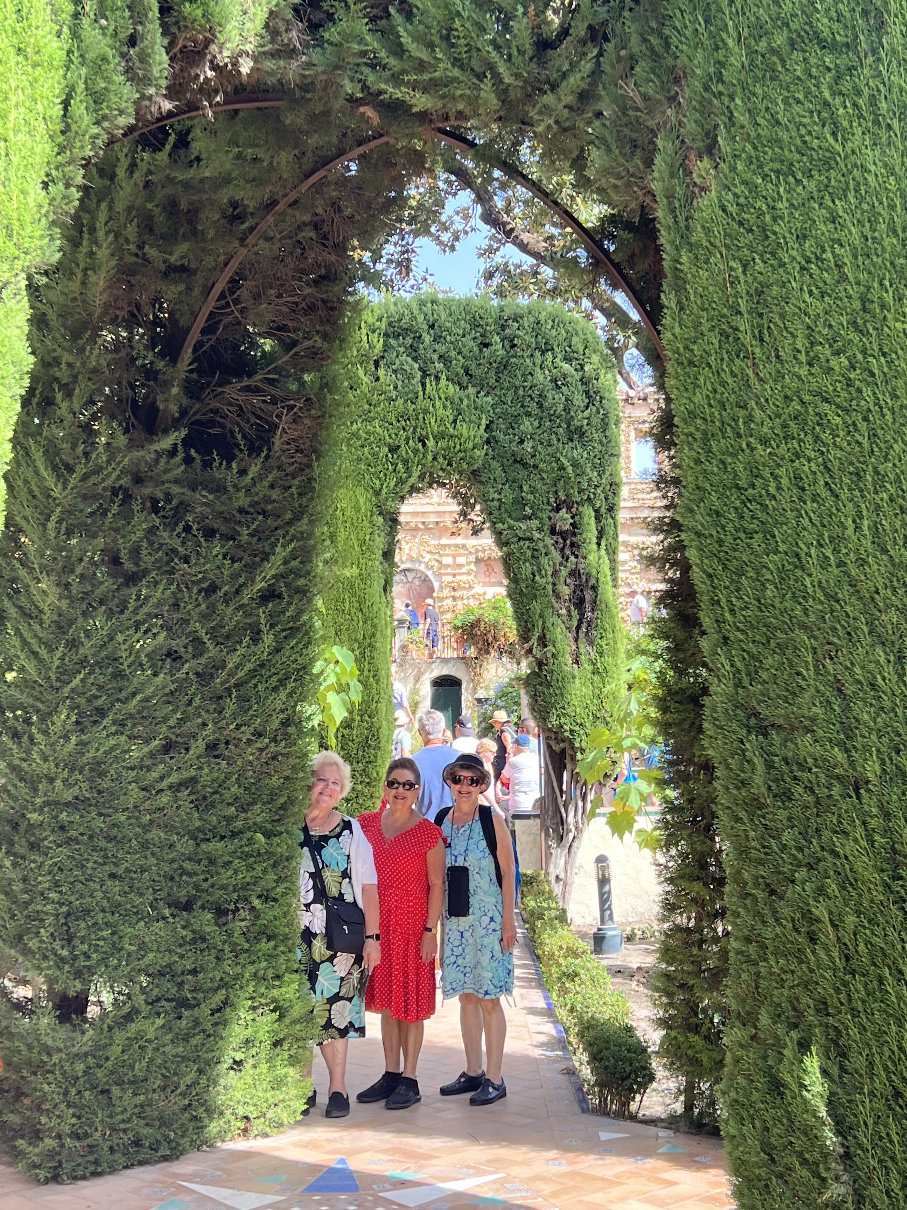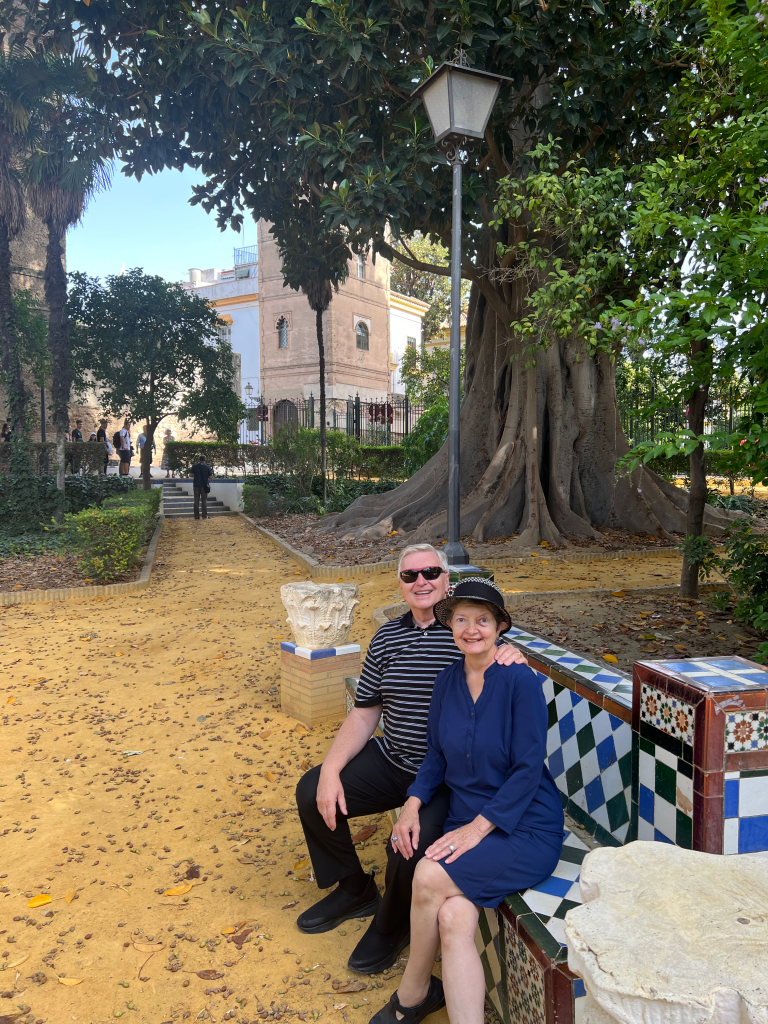 Our five days in Seville were delightful. We so enjoyed the city—the Spanish Exposition; the hop on hop off tour; the food; the people dressed in finery; Santa Cruz (the old Jewish Quarter with its narrow cobbled stone streets to catch the breezes and not allow sun to touch the lanes below) and mostly white buildings with interior courtyards; the Alcazar (beautiful Moorish design with ornate gardens and home to Spanish royalty); the international festival; the “Mushrooms” (the largest wooden structure in the world); shopping and spending hours people-watching in outdoor cafes.
