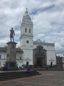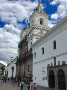 Quito is a wonderful city set between mountain vistas on all sides. Our day took us to some of the colonial gems of the El Centro, or historic center, of the city. We purposely made today a moseying kind of day to acclimate ourselves to the altitude. Two churches that stood out were Santo Domingo (right by our hotel) and San Francisco. Both were begun in the early 1500s and feature Baroque Spanish architecture–beautiful. On our walkabout, we happened upon several marching bands in a parade along one of Quito’s major shopping streets–an unexpected joy of travel.