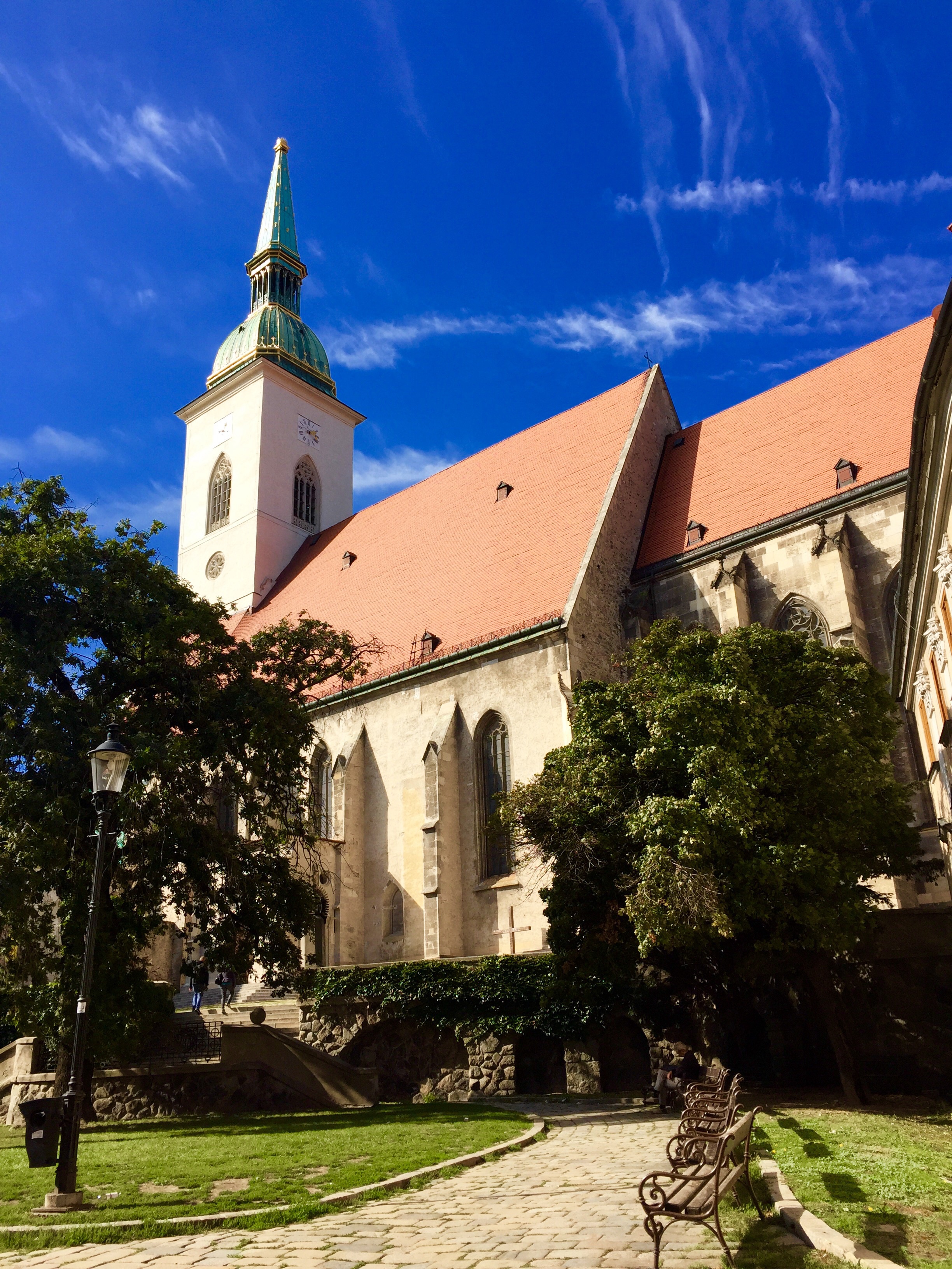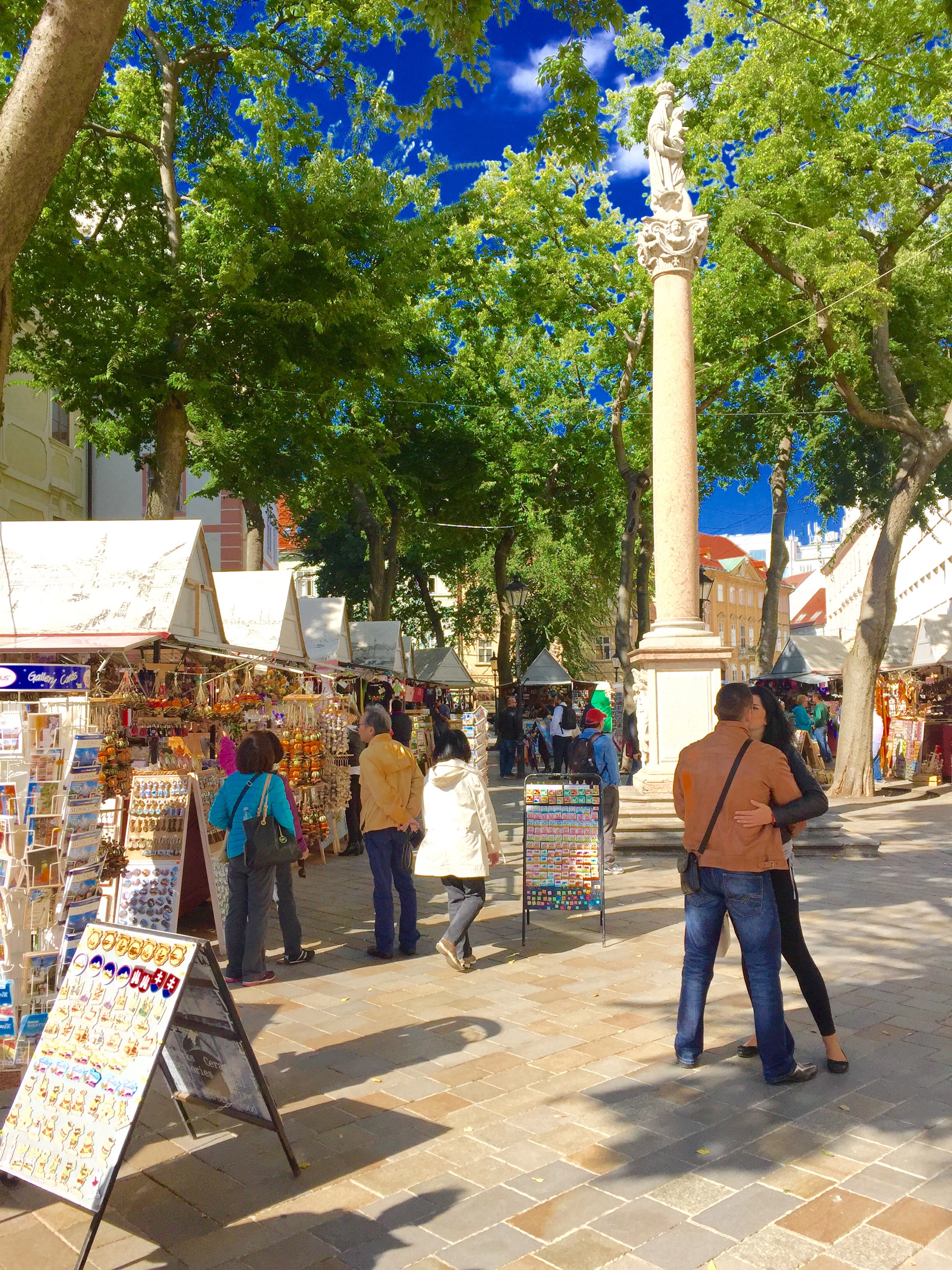 The Stare Mesto (Old Town) of Bratislava is charming. Church steeples abound. Mainly Roman Catholic, the city has a large share of Lutheran churches as well. The streets are thick cobblestone–really old time thick cobblestone. The narrow streets curve around so that you don’t end up where you thought you were going. But, that was ok, since where you went was pretty and interesting. I saw a big crystal beer mug, hand-cut and crafted in Slovakia, in a store window, and that is my main souvenir for the trip. Each ancient archway leads to a new street to search, and we walked hand in hand around the entire area. The castle fortress sits on the hill above the Stare Mesto and gives the area a majestic feel. So, as you can see, I walked enough to eat that pátê.